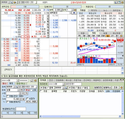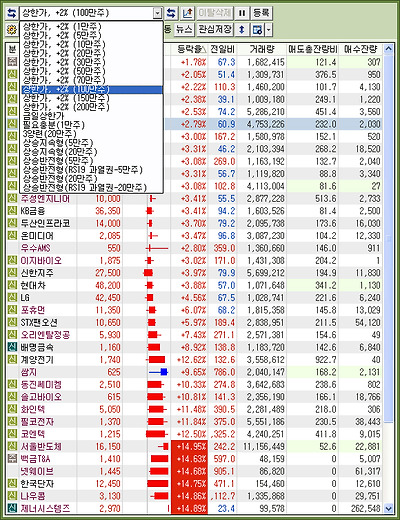 장이 시작되면, '전일대비등락률상위'를 검색하며 장초반에 강하게 가는 종목을 선정합니다. 종목조건을 설정하고 거래량을 전체조회, 1만주, 5만주, 10만주, 20만주, 30만주, 50만주, 100만주 이상 등으로 바꾸어가며 상승하는 종목을 골라 현재가창과 차트를 보며 매수의사를 결정합니다.