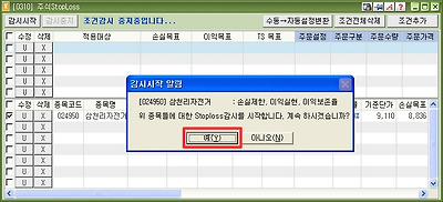 주식StopLoss 화면에서 '감시시작'을 누르시면 '감시시작 알림'창이 뜹니다. '예(Y)'를 누릅니다.