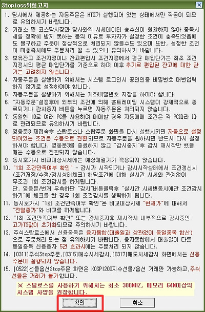 위의 유의사항을 잘 읽어보시면, '잘 안될 수도 있고 그에 따른 책임을 우리는 못지니 참고하세요.' 라고 요약할 수 있습니다. 이제 [0310] 주식StopLoss 화면을 보시겠습니다.