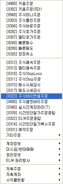키움 영웅문 HTS의 메뉴 중 주식주문을 클릭하시면 아래와 같이 '[0323] 주식바이앤셀주문'과 '[0400] 주식셀앤바이주문이 있습니다. 둘의 차이는 전자는 '수동매수·자동매도'이고 후자는 '수동매도·자동매수'의 차이입니다.