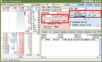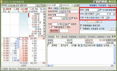 1. 매수 주문은 평상시와 같이 하면 됩니다. 그런데 오른쪽 매도주문은 자신이 세팅하면 됩니다. 매도주문시 매도가격은 매수주문의 몇%로 할 수도 있고 가격을 직접 입력해도 됩니다. 첫번째로 가격을 직접 입력하는 방법은 제가 오늘 사용한 방법이며 10,000원에 100주를 매수주문하고 10,200원에 자동으로 전량 매도세팅을 해 놓았는데 상한가를 이탈한 주가가 9,990원까지 하락했으니 매수가 되었고 상한가에 진입하여서 자동으로 매도가 되었습니다.