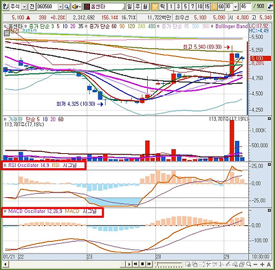 아래는 기본 RSI에 시그널선과 오실레이터를 설정한 화면입니다.