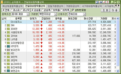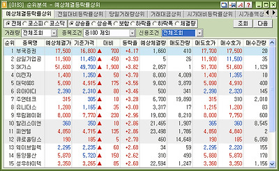 저는 장이 끝나고 종목을 정리해 두었다가 차트, 뉴스 등을 보고 익일 어떤 종목에 주안점을 두어야 하는지 결정을 합니다. 그리고 익일 아침 장 시작 전 [0180]순위분석창을 띄워놓고 '예상체결등락률상위'를 검색합니다. 오늘 강하게 가려고 하는 종목을 어제 선정해 놓았던 종목과 비교해 압축해 나가는 것이지요. 거래량이나 종목조건, 신용조건 등을 자신의 기준에 맞게 설정하여 검색합니다.