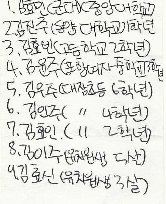 * 여섯째 인주가 적어 준 9남매 명단(?)