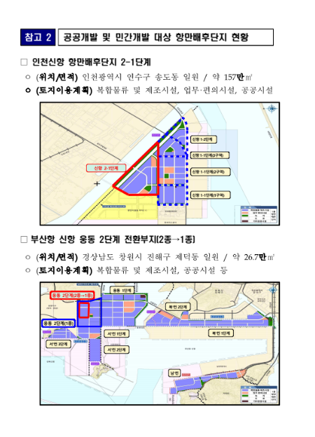 | - 인천신항 2-1단계는 공공개발, 부산항 신항 웅동 2단계 전환부지는 민간개발 방식으로 추진 |