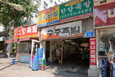 지하철 5, 6호선 공덕역 4, 5번 출구로 나와 한겨레신문사 방향으로 가다보면 길 왼쪽에 족발골목이 나온다. 예전에는 이곳이 재래시장이었지만 지금은 족발집들이 모여 있다. 족발골목의 역사는 지금부터 약 30여 년 전에 시작됐다. 당시 공덕시장 한쪽에 2평 남짓 되는 식당을 차려 놓고 족발을 팔았던 집이 공덕동 족발골목의 효시다. 그때는 순대국과 함께 족발을 팔았다. 식당이 잘 되자 주변 상가들이 업종을 바꾸었고 재래시장의 면모를 잃긴 했지만 족발골목은 번성했다. 이 골목 족발집이 인기를 얻는 이유는 푸짐한 양과 특별한 서비스 음식이다. 족발을 시키면 뜨끈한 술국과 순대 한 접시가 공짜로 나온다. 족발의 양도 많아서 큰 것을 시키면 4명이 먹기에도 충분하다. 뜨끈한 국물은 리필이 되므로 국물을 좋아하는 사람들에게 인기가 좋다.그렇다고 양으로만 승부하는 것은 아니다. 맛있는 족발을 만들기 위한 노력을 아끼지 않는다. 집집마다 맛을 내는 비법은 다 다르지만 어떤 집은 12가지 한방 및 천연 재료를 넣어 족발의 맛을 완성한다. 사람이 몰릴 때는 기다렸다가 입장해야 하는 경우도 있다. 30년이 훌쩍 넘은 세월 동안 맥을 잇고 있는 공덕동 족발골목은 현재와 과거가 공존하는 추억의 장소이다.
