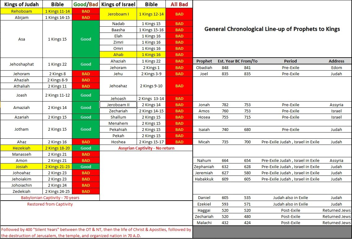 성경에서 왕은 하나님에 대한 신실함, 하나님의 율법에 대한 순종, 백성들에 대한 리더십에 따라 "좋은" 또는 "나쁜" 왕으로 분류되는 경우가 많습니다. 다음은 간략한 개요입니다: