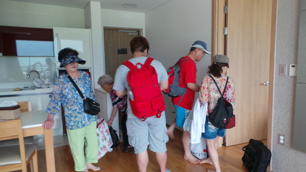 델피노 콘도 발코니에서 울산바위를 배경으로 사진을 찍으시는 두 어르신