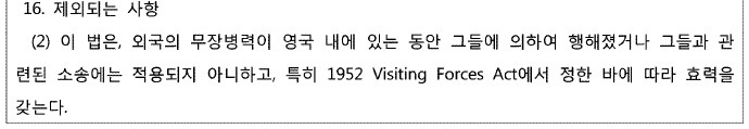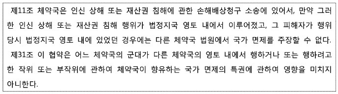 33)유럽 국가면제협약에 대한 Explanatory Report to the European Convention on State Immunity는 협약 제31조에 관하여, "위 협약은 무력 분쟁 중 발생한 사건에 관하여 규율하는 것을 의도하고 있지 아니할 뿐만 아니라 동맹국 사이에 군대 주둔으로 인하여 발생한 문제에 관하여도 적용될 수 없다. 이러한 문제들은 일반적으로 국가간의 별도의 합의에 의하여 해결된다"라고 밝히고 있다(The Convention is not intended to govem situations which may arise in the event of armed conflict ; not can it be invoked to resolve problems which may arise between allied States as a result of the stationing of forces. These problems are generally dealt with by special agreements).