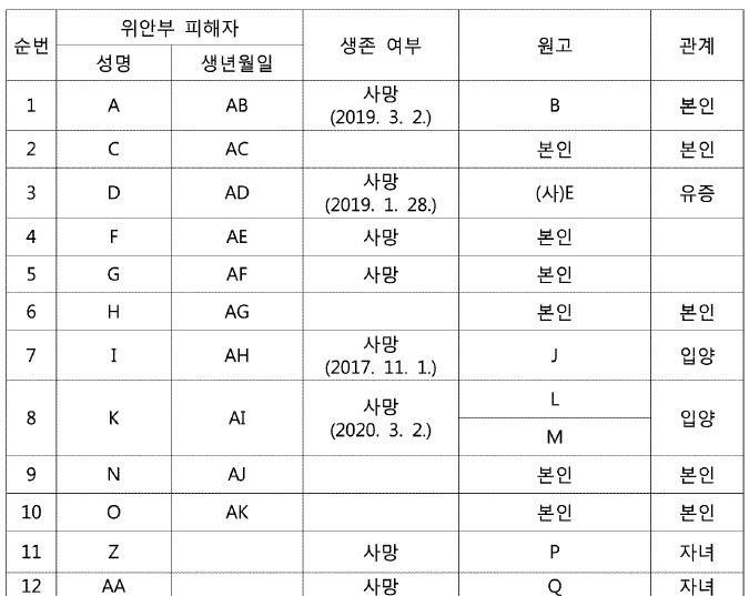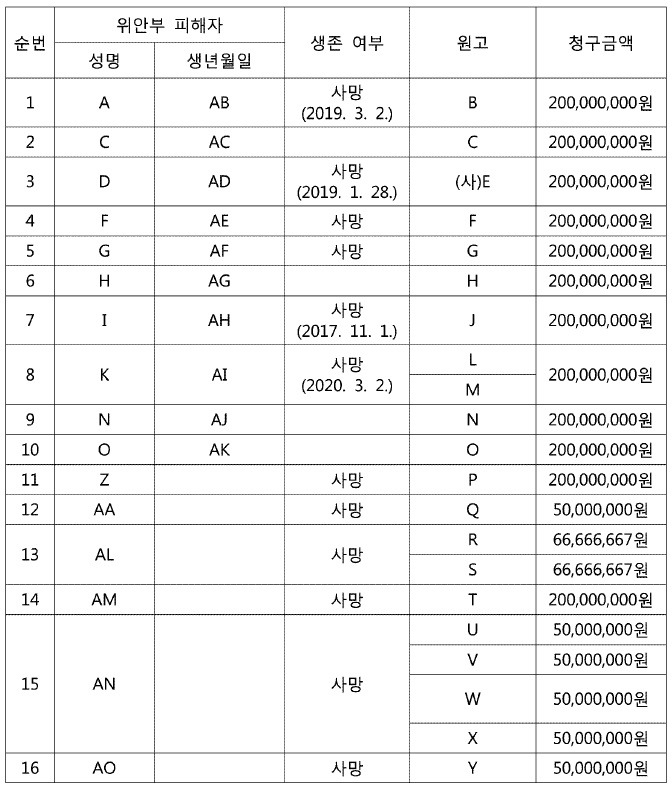 나. 이 사건 피해자들 중 순번 2, 6, 9, 10(C, H, N, O)은 현재 생존 중이고, 나머지 피해자들 중 순번 11 내지 16(Z, AA, AL, AM, AN, AO)은 이 사건 소 제기 이전에 사망하여, 위 표 중 원고란 기재 원고들이 위 피해자들이 권리ㆍ의무를 상속하였으며, 순번 1, 3, 7, 8(A, D, I, K)은 이 사건 소 제기 이후 사망하여, 해당 항목의 원고란에 기재된 자들이 상속 또는 유증 등에 의하여 위 피해자들의 권리ㆍ의무를 승계하고, 이 사건 소송절차를 수계하였다. 그리고 위 피해자들 중 순번 4, 5(F, G)도 사망하였으나, 그 상속인이 확인되지 아니하여 이 사건에서 소송수계절차가 이루어지지 아니하였다.