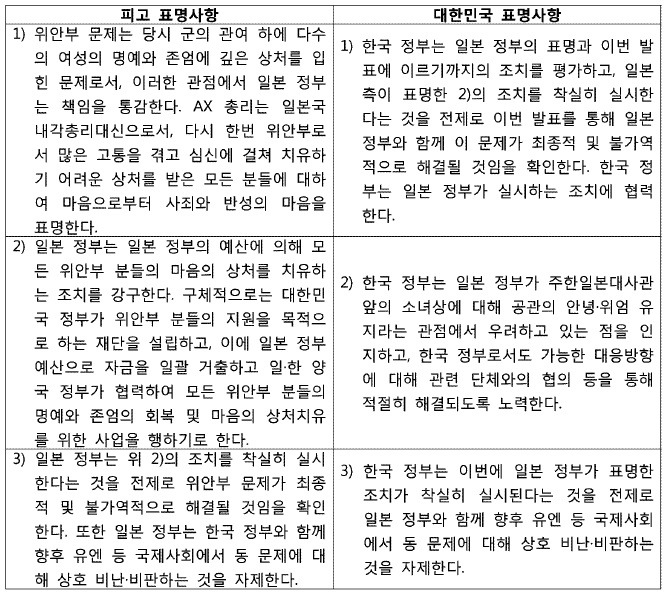 대한민국의 AT인 AU와 피고의 외무대신 AV는 2015. 12. 28. 아래 표 기재와 같은 내용으로 합의하여 '한ㆍ일 외교장관회담 공동기자회견'을 통해 이를 공표하였고, 당시 양국 정상인 대한민국 대통령 AW와 피고 총리대신 AX는 이후 전화 통화로 위 합의 내용을 추인하였다. 위 기자회견은 양국 정부를 대표하는 외교장관이 공개적인 내ㆍ외신 공동기자회견을 통하여 공식 입장으로 발표한 것으로서 별도로 합의 내용을 문서화하지는 아니하였다(이하 대한민국과 피고 사이의 위 합의를 '2015. 12. 28. 한ㆍ일 합의'라 한다).