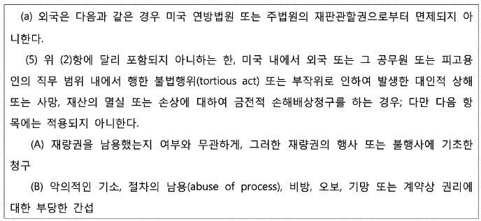 ④ 기존의 제한적 면제론보다 국가 면제의 예외를 더 넓게 인정함으로써, 외국에 대한 민사 재판권의 범위를 확대할 것인지의 문제는, 이 법원의 외교부에 대한 사실조회결과에 나타난 바와 같이 '대한민국의 외교 정책과 국익'에 잠재적인 영향을 미칠 수 있는 사안이다. 그리고 앞서 본 국가 면제의 예외에 관한 각국의 개별 입법 내용이 각국의 입법정책과 이해관계 등에 따라 상이하게 규율된 점을 고려하여 보면, 국가 면제에 관하여 기존 제한적 면제론에서 인정되지 아니하던 새로운 예외를 인정할지 여부, 만약 새로운 예외를 인정한다면 어느 범위에서 인정할 것인지는 전적으로 대한민국의 국익에 미칠 有 ㆍ 不利를 냉정하게 고려하여 세밀하게 정해야할 사항으로서 기본적으로 행정부와 입법부의 정책 결정이 선행되어야 할 사항으로 봄이 타당하다(실제로 앞서 본 '법정지국 영토 내 불법행위'에 관하여 독자적인 개별 입법을 한 국가들의 규정 내용, 특히 외국의 주권적 행위에 대한 각국의 재판권 행사의 범위에 관한 규율 내용이 나라마다 상이하고, 국제 협약을 비준함에 있어서도 각국은 유보조항을 두거나 또는 자국의 입장을 선언하는 방식으로 자국의 입장을 반영하려 하였는데, 이는 이들 국가들이 외국에 대한 민사 재판권 행사의 어느 범위까지 할 것인지, 즉 전통적인 국가 면제에서 인정되는 범위를 넘어 어느 범위까지 자국의 민사 재판권을 확대할 것인지에 관한 각국의 이해관계가 반영되었다고 봄이 합리적이다). 그럼에도 이러한 사항에 관한 입법부와 행정부의 정책적 의사결정이 없는 상황에서, 구체적인 사건에 대한 분쟁 해결을 주된 사명으로 하는 사법부가 이러한 결정을, 그것도 매우 추상적인 기준밖에 제시할 수 없어서, 향후 상당한 정도의 불확실성을 초래할 수밖에 없는 방식으로 행하는 것은 적절치 아니하다.