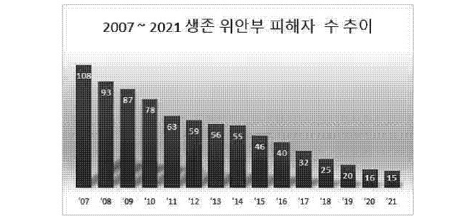(3) 등록된 위안부 피해자들이 고령이어서 시간의 경과에 따라 그들 중 다수가 사망한 결과, 2007. 12. 31. 기준 108명이던 생존 위안부 피해자는 2021. 2. 21. 기준 15명으로 감소하였다. 2007년경부터 2021. 2. 21.까지 매년 12월말 기준(다만 2021년은 2. 21. 기준) 등록된 위안부 피해자들 중 생존자 현황은 아래 표와 같고, 2021. 2. 21. 기준 생존자와 사망자의 총 수는 240명(생존 피해자 15명, 사망 피해자 225명)이다.