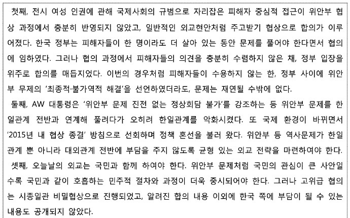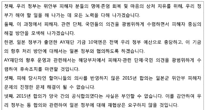 | 1. 대한민국은 2015. 12. 28. 한ㆍ일 합의가 역사문제 해결에 있어 확립된 국제사회의 보편적 원칙에 위배되고 피해자 중심주의 원칙에 반한 것으로 위 합의로 인하여 원고들이 정신적 고통을 겪었다는 점을 겸허히 인정한다. 대한민국은 2015. 12. 28. 한ㆍ일 합의가 위안부 피해자 문제의 진정한 해결이 될 수 없다는 점을 분명히 하고, 향후 피해자들의 존엄과 명예를 회복하기 위한 대내외적인 노력을 계속한다. 2. 원고들3) 은 이 사건 소를 취하한다. 3. 소송 및 조정 총비용은 각자 부담한다. |
