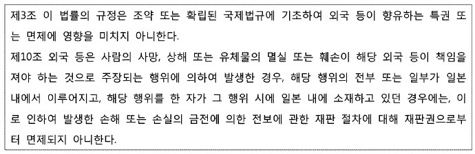 가. 앞서 본 바와 같이, 일본 법률 제10조는 피고 영토 내 불법행위로 인한 인신 손해 등에 대한 손해배상청구에 관하여 외국에 대한 국가 면제를 인정하지 아니하는 규정을 두고 있음은 인정된다.