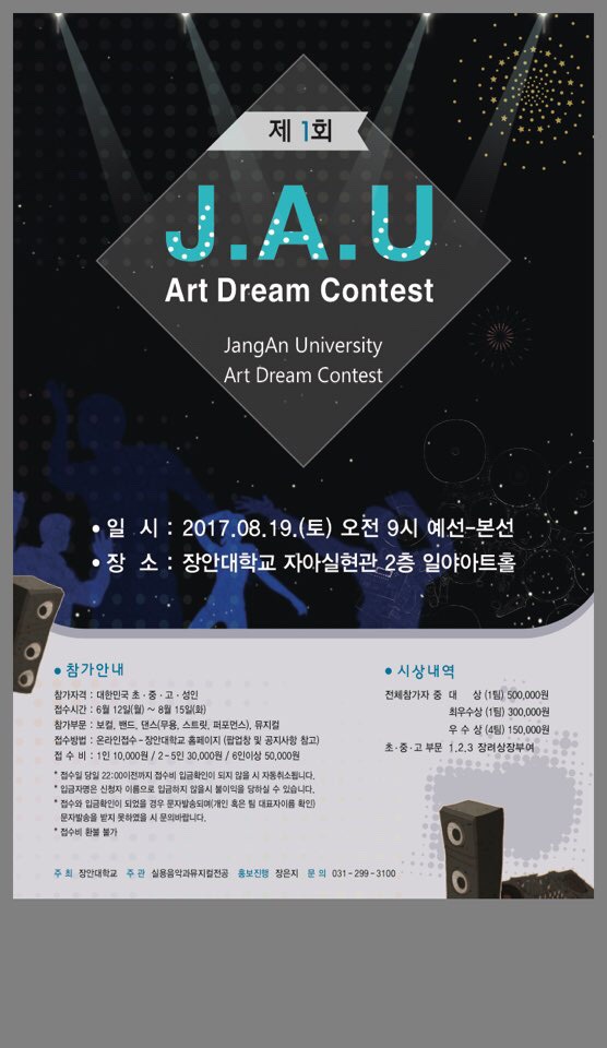 2017 장안대학교 예술제 대회 작성자장안대|작성시간17.07.27|조회수42 목록 댓글 0 글자크기 작게가 글자크기 크게가 2017 장안대학교 예술제 대회 다음검색 현재 게시글 추가 기능 열기 북마크 공유하기 신고 센터로 신고 댓글 댓글 0 댓글쓰기 답글쓰기 댓글 리스트