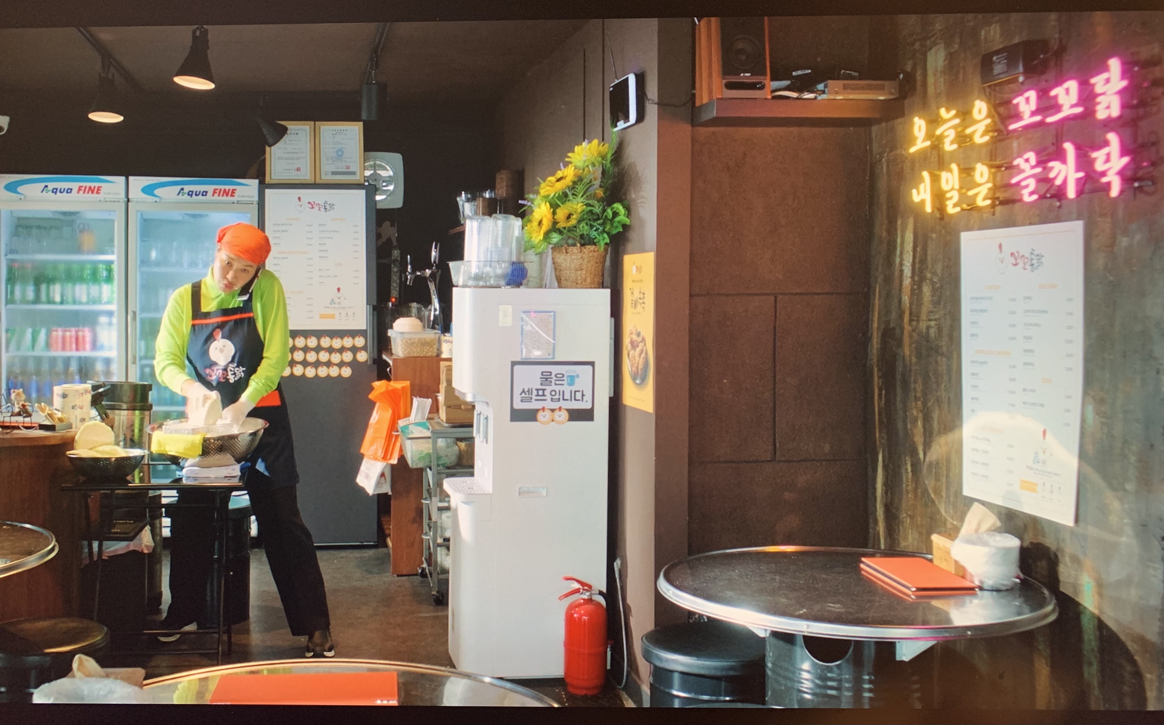 은강이의 주황 사랑이야 이미 스틸컷을 통해 드러난 건데(방을 봐도 주황색 천지죠?) 보다보니 어머니도 주황색 좋아하시나봐요. 두건, 비닐봉투(배달할 때도 이 봉지에 넣어서 가져갑니다), 메뉴판까지.. 그리고 “오늘은 꼬꼬닭 내일은 꼴까닭” ㅋㅋ