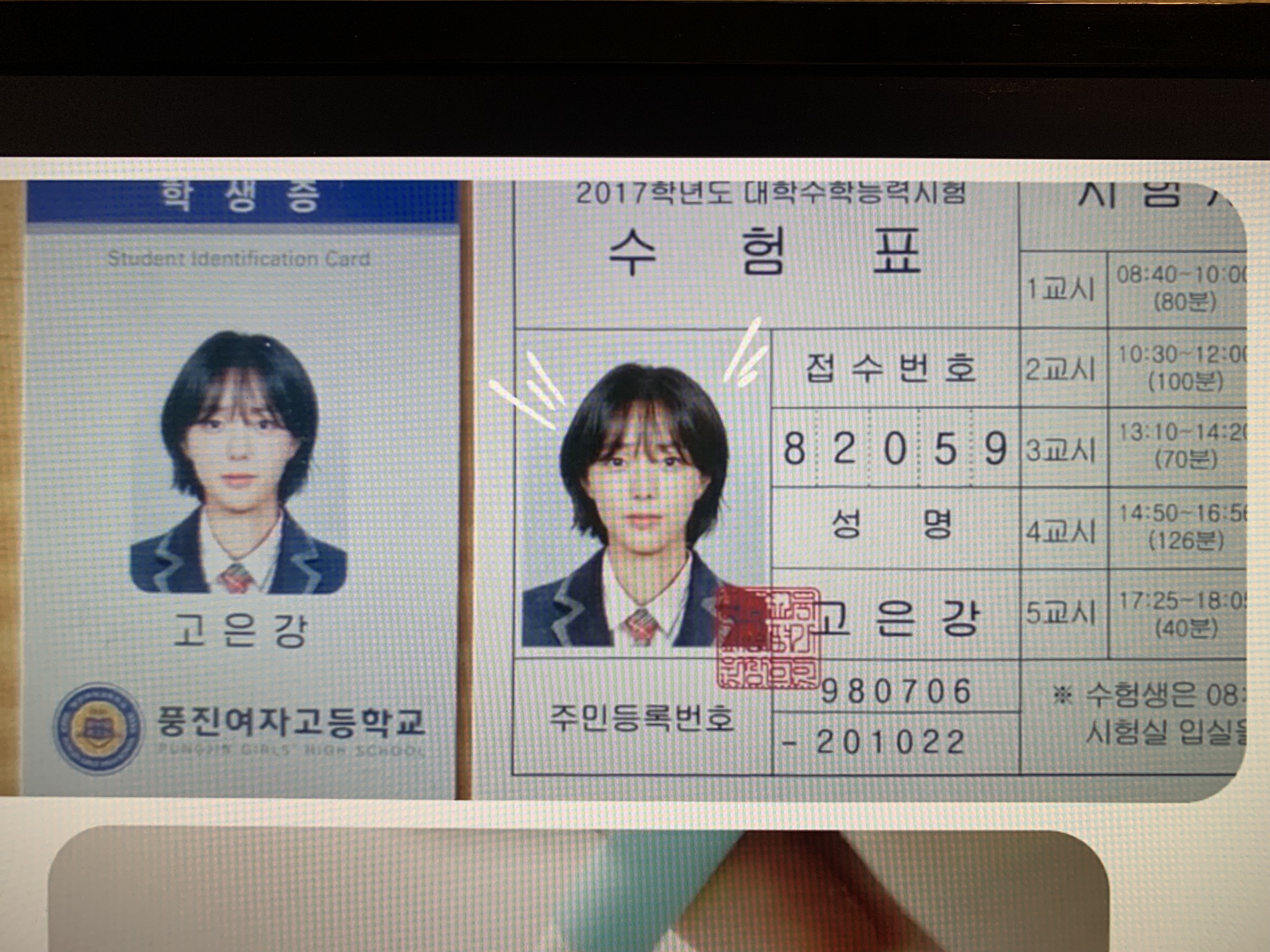 은강이 첫 등장인 면접 장면에서 이미 수험표가 나와서 생년월일이 나오지만 수능 장면에서 아예 주민등록번호가 다 나와서 이걸 찍었습니다. 생년월일까지 따지면 현대극 중에선 제일 어릴 수도 있겠다 싶었는데 은강이는 98년 7월 6일 생으로 수아랑 해림이보다 한 살 많군요