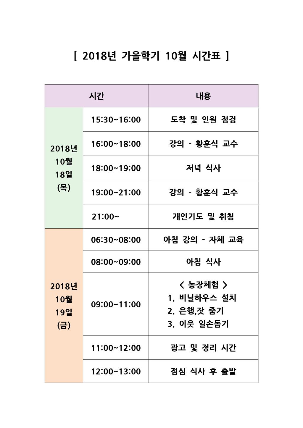 2018년 가을학기 10월 시간표 작성자변일국|작성시간18.10.17|조회수639 목록 댓글 0 글자크기 작게가 글자크기 크게가 다음검색 현재 게시글 추가 기능 열기 북마크 공유하기 신고 센터로 신고 댓글 댓글 0 댓글쓰기 답글쓰기 댓글 리스트