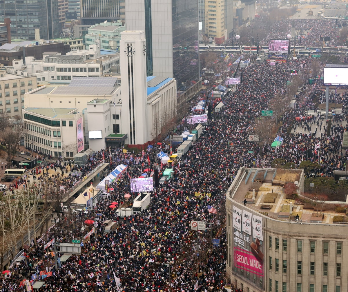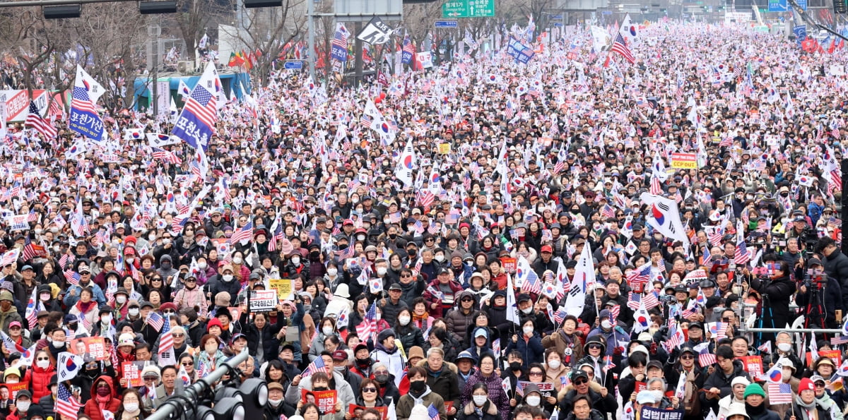 1일 오후 광화문 광장 일대에서 열린 천만 광화문 국민대회에서 참가자들이 윤석열 대통령 탄핵 기각을 촉구하고 있다.