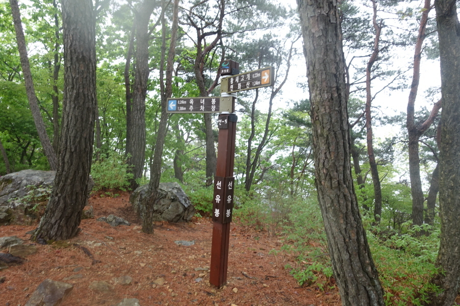 이정표(선유봉0.22km/옥녀봉0.48km/탄금봉0.74km//남산0.36km/연화산1.02km//청련암0.32km/옥천사0.58km)서있다. 선유봉 오름길이 힘들다. (14;45)비에 젖은 바위길을 밟고 올라서니 (14;47)선유봉 정상이다.[0.2km][9분]
