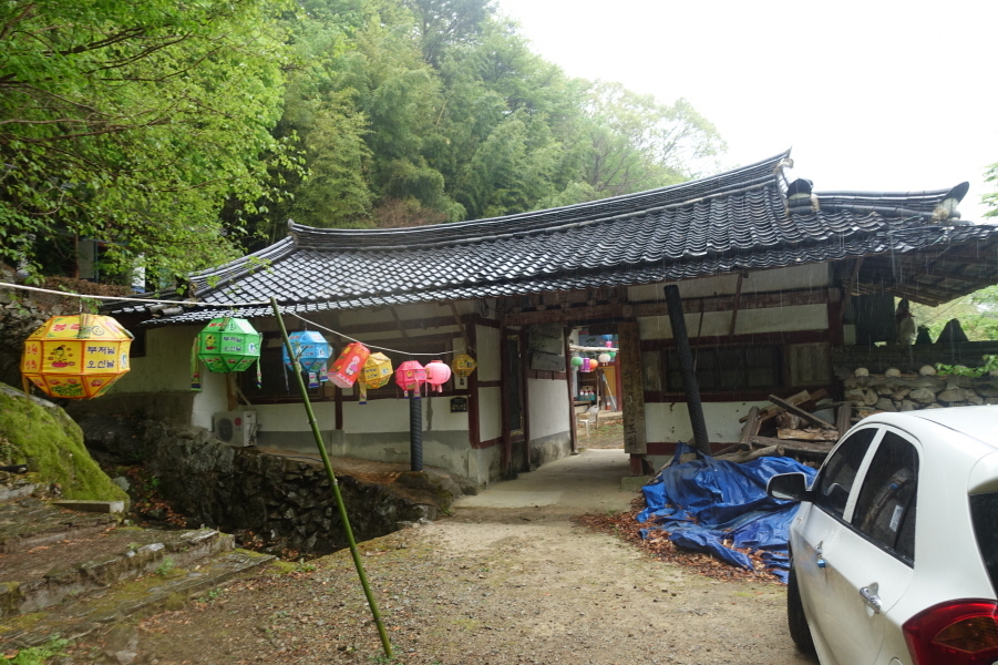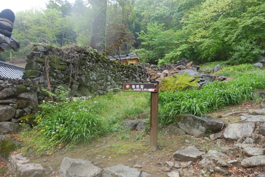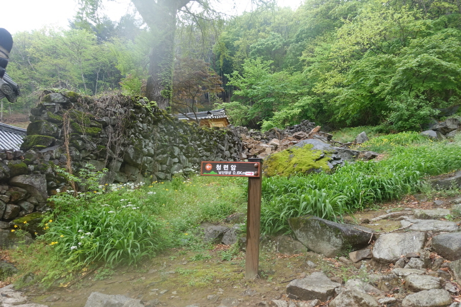 (14;17)백련암 이정표(매봉<연화1봉>0.64km) 서있고 비에 젖은 백련암 절집이 단아하다. (14;20)임도길에서 가야할 선유봉 능선을 조망하고 (14;22) 옥천사 이정표(화장실/대웅전/백련암)에서 우향 돌계단길을 밟고 (14;25) 청련암 입구 도로에 선다.[1.2km][23분]