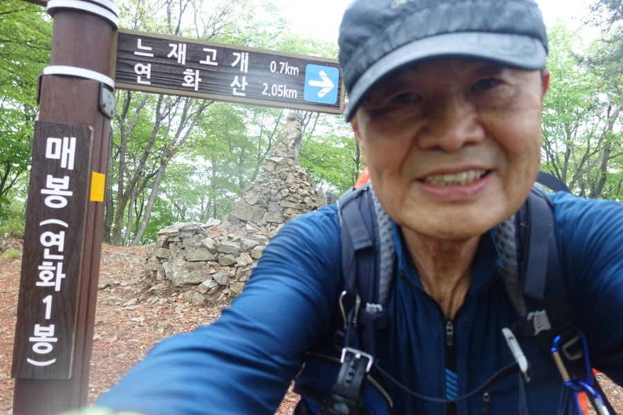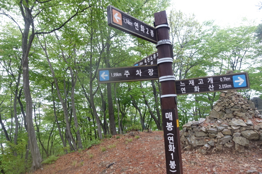 (14;00~14;02)[2분]연화1봉(매봉) 정상표지목겸 이정표(백련암0.7km/옥천소류지1.06km/주차장1.99km/느재고개0.7km/연화산2.05km/연화2봉1.74km)인증사진입니다.