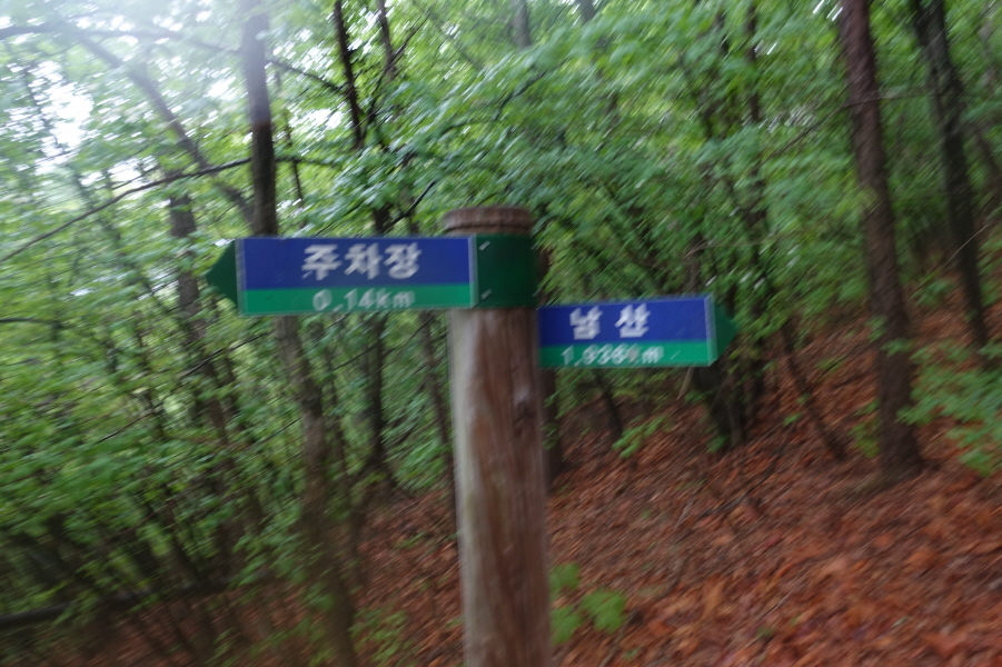 (15;12) 이정표(주차장0.14km/남산1.036km)입니다. 오래된 이정표에는 탄금봉. 옥녀봉. 선유봉이 없고 남산을 안내합니다.