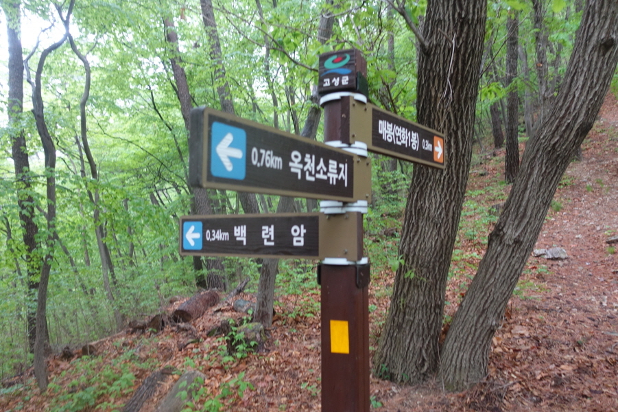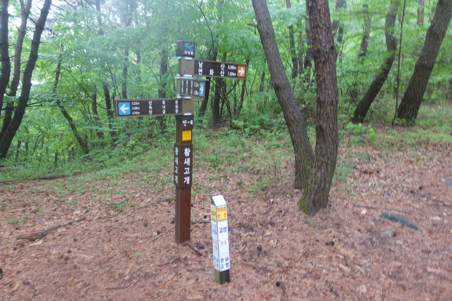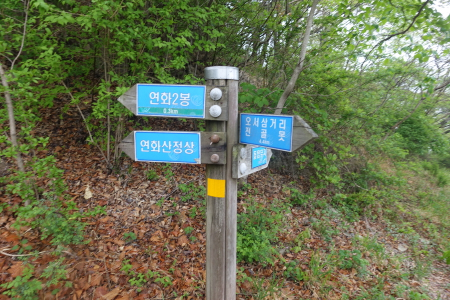 (14;10)안부 이정표( 백련암0.4km/옥천소류지0.7km/매봉<연화1봉>0.3km)3거리입니다.