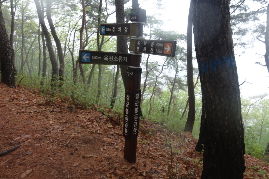정상표지목겸 이정표(주차장1.06km/옥천소류지0.62km/옥녀봉0.26km/연화봉1.76km)서있다. 셀카 인증사진 남기고 표지기 걸고 하산길에 든다. (15;01) 이정표(주차장0.6km)을 지나 목책계단을 내려서고 (15;12) 이정표(주차장0.14km/남산1.036km)를 표시한 오래된 이정표를 지나 (15;15)이정표(장군봉.탄금봉1.06km/연화산2.82km) 서있는 (15;15)공룡발자욱 화석지주차장(개천면 북평리 574-3)에 도착 산행종료한다.[1.1km][17분]