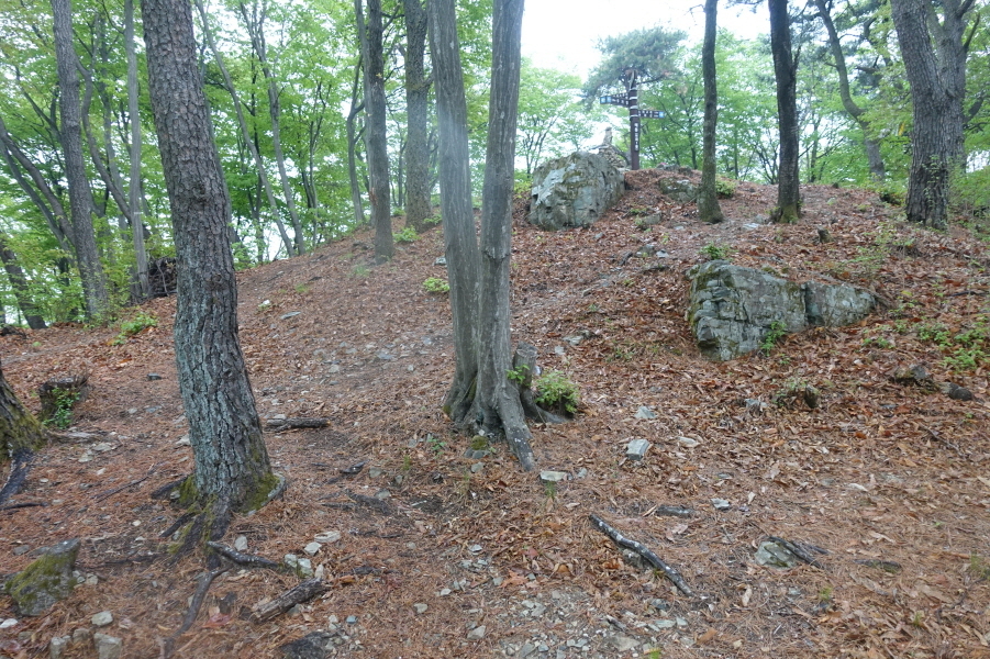 낡은 삼각점(진주23/1991복구)이 있고 선답자님들의 표지기 몇장이 걸려 있다. 정상표지판이나 정상석은 없다. 조금 아래 돕탑과 봉화대 표시판이 서있다. 비때문에 조망을 즐기지 못한다. 혼돈산과 어산. 연화산이 가까히 조망될텐데 아쉽다.