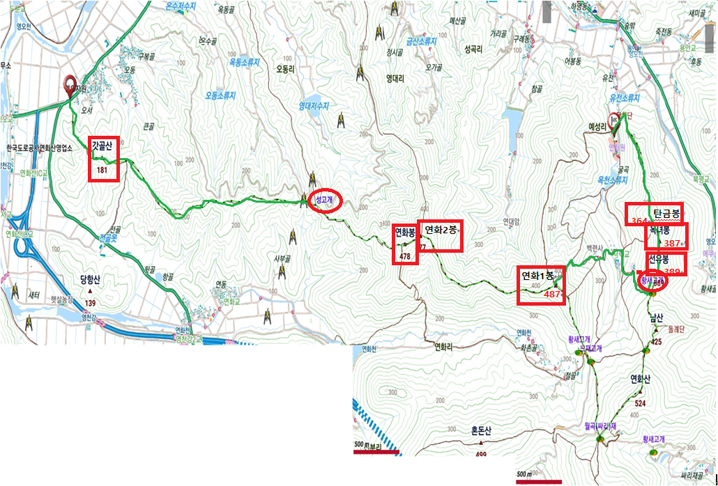 산행코스;고성군 영오면 오서리SK주유소-167.3- 갓골산(181m)-성고개-연화봉(478.2m)-연화2봉(477m)-연화1봉(487m)-백련사-옥천사-청련암-황새고개-선유봉(389m)- 옥녀봉(387m)-탄금봉(364m)-능선 끝 목책책계단-공룡발자욱 화석지주차장(개천면 북평리 574-3)