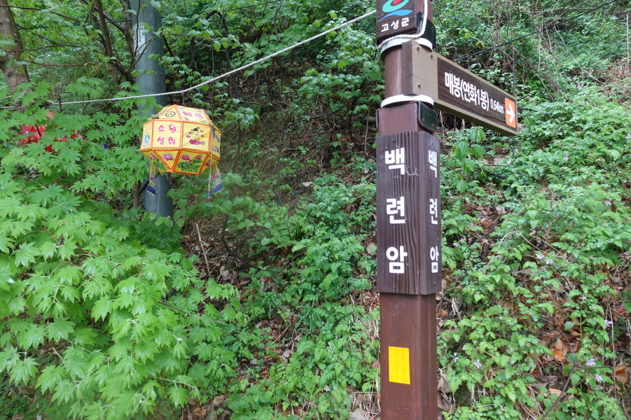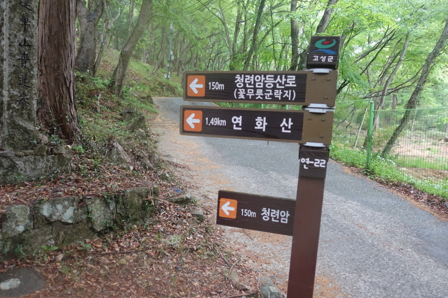 914;25)청련암입구 이정표(청련암150m/청련암등산로<꽃무릇군락지>150m/연화산1.49km)입니다.