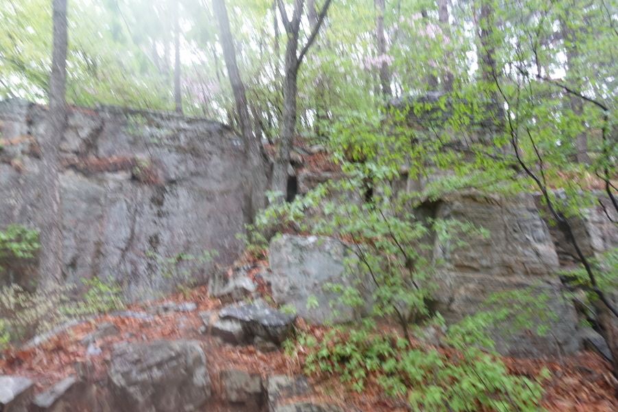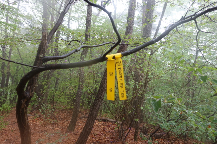 좌향 이정표(백련암0.7km/옥천소류지1.06km/주차장1.99km)방향 내림길 내려선다. 비에 젖은 급경사 내림길이 미끄럽다. 2번째 밟는 길이지만 기억이 없다. (14;10)안부 이정표( 백련암0.4km/옥천소류지0.7km/매봉<연화1봉>0.3km)3거리다. 우향 이정표(백련암0.4km)방향 내림길 내려선다.