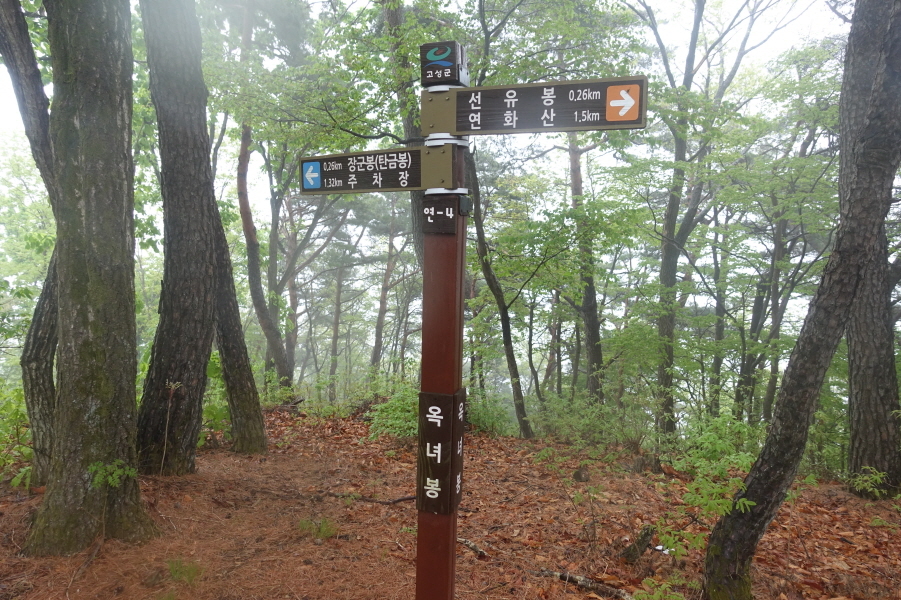 (14;53) 옥녀봉 정상표지판겸 이정표(장군봉<탄금봉>0.26km/주차장1.32km//선유봉0.26km/연화산1.5km)입니다.