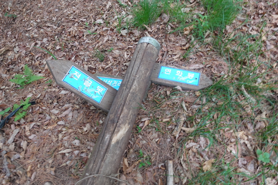 (12;23)쓰러져 누운 낡은 이정표(연화봉3.7km/전골못0.7km/오서3거리)입니다.