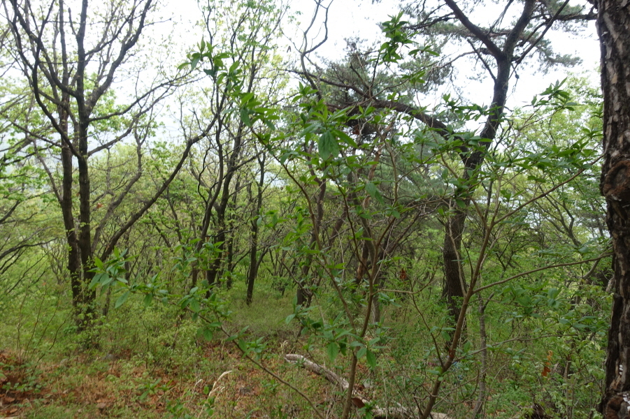 선답자님들의 표지기 몇장이 걸려있을 뿐 정상석이나 정상 표지판 아무 것도 없다. 갓골산 정상내려서고 내려선 안부에는 (12;23)쓰러져 누운 낡은 이정표(연화봉3.7/전골못0.7/오서3거리)다. 완만한 오름능선을 빠르게 진행한다. 평탄한 능선이다가 부드러운 오름후 우측능선 분기점에서 좌측으로 틀어 평탄하고 곧 우측능선 분기봉을 오르지 않고 좌측 사면의 뚜렷한 족적을 따른다. 금방 방향은 좌측(동)으로 틀어가고 잠시 후 부드러운 오름이고 x215.8m 능선 분기점에서 허리길 따르다가 잠시 알바하고 봉에 올라 좌측으로 내려서고 금방 내려선 곳에서 오르면 능선은 고만하다가 부드럽게 내려선다. 약230m의 좌우능선 분기봉을 오르지 않고 우측사면의 뚜렷한 길을 따라 잠시 내려서니 좌측 바로 옆에 임도가 있는 성고개다. 송전탑을 지나 오르면 능선상에 지도상 성고개다.[2.9km][40분]