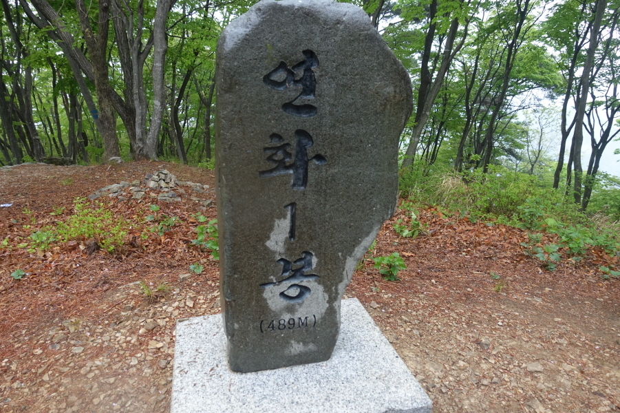 (13;30) 봉화대 표지판 배경으로 인증사진 남기고 너덜을 밟으며 잠시 내려서고 몇 걸음 올라서면 영오면과 개천면의 경계를 이루는 북쪽능선 분기점(13;33) 연화2봉 정상이다.[0.3km][3분]