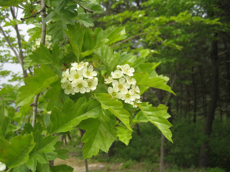 나무껍질 나무껍질은 보랏빛의 갈색이다. 5월의 태양이 눈부시게 내리쬐는 날, 청초한 초록 잎 사이로 하얀 꽃구름을 피워 청춘을 유혹하는 나무가 있다. 햇빛을 워낙 좋아하여 야산의 능선이나 숲 가장자리의 양지바른 곳에서 고운 자태를 비로소 볼 수 있다. 우리 이름은 산사나무, 영어 이름은 ‘오월의 꽃’이다. 대체로 더운 지방보다는 북반구의 온대지방에서 널리 자란다. 고대 희랍에서의 산사나무는 희망의 상징으로서 봄의 여신에게, 로마 사람들은 꽃의 여신에게 바쳤다. 지금도 5월 1일이면 산사나무 꽃다발을 만들어 문에 매달아 두는 풍습이 있다. 영국에도 산사나무에 얽힌 전설이 많이 남아 있으며, 5월이 되면 태양숭배를 상징하는 축제를 열고 하루 종일 야외에서 춤을 추면서 보낸다고 한다. 이때쯤 활짝 피는 산사나무 꽃은 5월의 상징이었다. 그래서 영어 이름은 ‘메이플라워’, 즉 오월의 꽃이다. 산사나무 꽃은 행복의 상징이었으며, 아테네의 여인들은 결혼식 날 머리를 장식하는 데 이용했다. 로마에서는 산사나무 가지가 마귀를 쫓아낸다고 생각하여 아기 요람에 얹어두기도 했다 . 이렇게 서양 사람들은 꽃의 아름다움에 취했다면 동양 사람들은 열매의 약리작용에 일찍부터 관심을 가졌다. 중국과 일본 및 우리나라에서는 산사나무 열매를 ‘산사자(山査子)’라 하여 감기 기침은 물론 소화불량을 치료하는 약으로 널리 쓰였다는 기록을 찾을 수 있다. 《산림경제(山林經濟)》각주1) 〈치약(治藥)〉 편에 보면 “산속 곳곳에서 나는데 반쯤 익어 맛이 시고 떫은 것을 채취하여 약에 쓴다. 오래 묵은 것이 좋으며 물에 씻어 연하게 쪄서 씨를 제거하고 볕에 말린다”라고 나와 있다. 구슬만 한 크기에 전체 모습은 귀여운 아기사과와 영락없이 닮았다. 핏줄을 속일 수는 없는 듯, 산사나무는 장미과 중 배나무아과(亞科)라 하여 사과나무와 한 족보를 이루기 때문이다. 열매를 씹어 보면 역시 사과처럼 새콤하고 달큼한 맛이 난다. 《계산기정(薊山紀程)》각주2) 에는 “산사는 크기가 밤알만 하고, 살이 많고 맛이 좋으며, 보드라운 가루로 만들어 꿀에 타 떡을 만든다”라고 나와 있다. 또한 산사 떡이나 산사정과(正果)를 만들어 먹기도 했다. 어원을 알 수는 없으나 옛 이름은 아가위나무다. 산사나무는 전국에 걸쳐 자라는 갈잎나무로 키 4~5미터에 지름은 한 뼘 정도로 흔히 만날 수 있는 크기다. 그러나 최근 천연기념물 506호로 지정된 서울 영휘원의 산사나무는 줄기둘레가 한 아름이 훨씬 넘는 203센티미터에 키가 9미터에 이른다. 우리가 흔히 볼 수 있는 보통의 나뭇잎은 긴 타원형에 가장자리는 얕은 톱니가 있거나 밋밋하다. 그러나 산사나무 잎은 평범함을 거부한다. 잎이 불규칙하고 깊게, 때로는 거의 가운데 잎맥까지 패어 있다. 우리나라 나무 중에는 이런 특별한 잎이 없기 때문에 한번 보면 금방 알아낼 수 있다. |