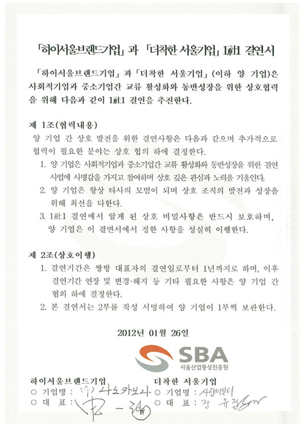 이번 1사1 결연은 서울시와 중소기업지원 SBA(서울산업통상진흥원)이 서울시의 우수 사회적기업인 ‘더착한 서울기업’을 우수 중소기업 ‘하이서울브랜드기업’과 결연을 맺게 함으써 사회적 가치를 창출하면서도 매출상승을 기대하는 사업이다..