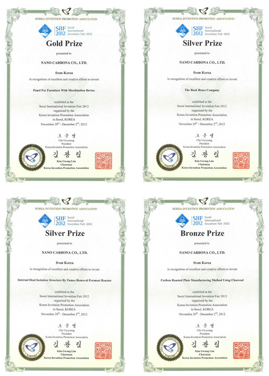 수상내역을 살펴보면 우선 대한민국 발명 특허대전 은상에는 이번에 (주)나노카보나가 출품한 ▲ 무냉각 고압축,고효율 탄소성형체 제조방법 특허가 선정되었으며, 서울국제발명전시회 금상으로는 ▲뜸장치와 가구패널, 은상으로는 ▲허리보조기회사부문 ▲내부열 절연구조 구이판이 선정되었으며, 동상에는 ▲숯을 이용한 탄소구이판 제조방법이 선정되어 각각 발명과학적 기술력을 인정받았습니다.