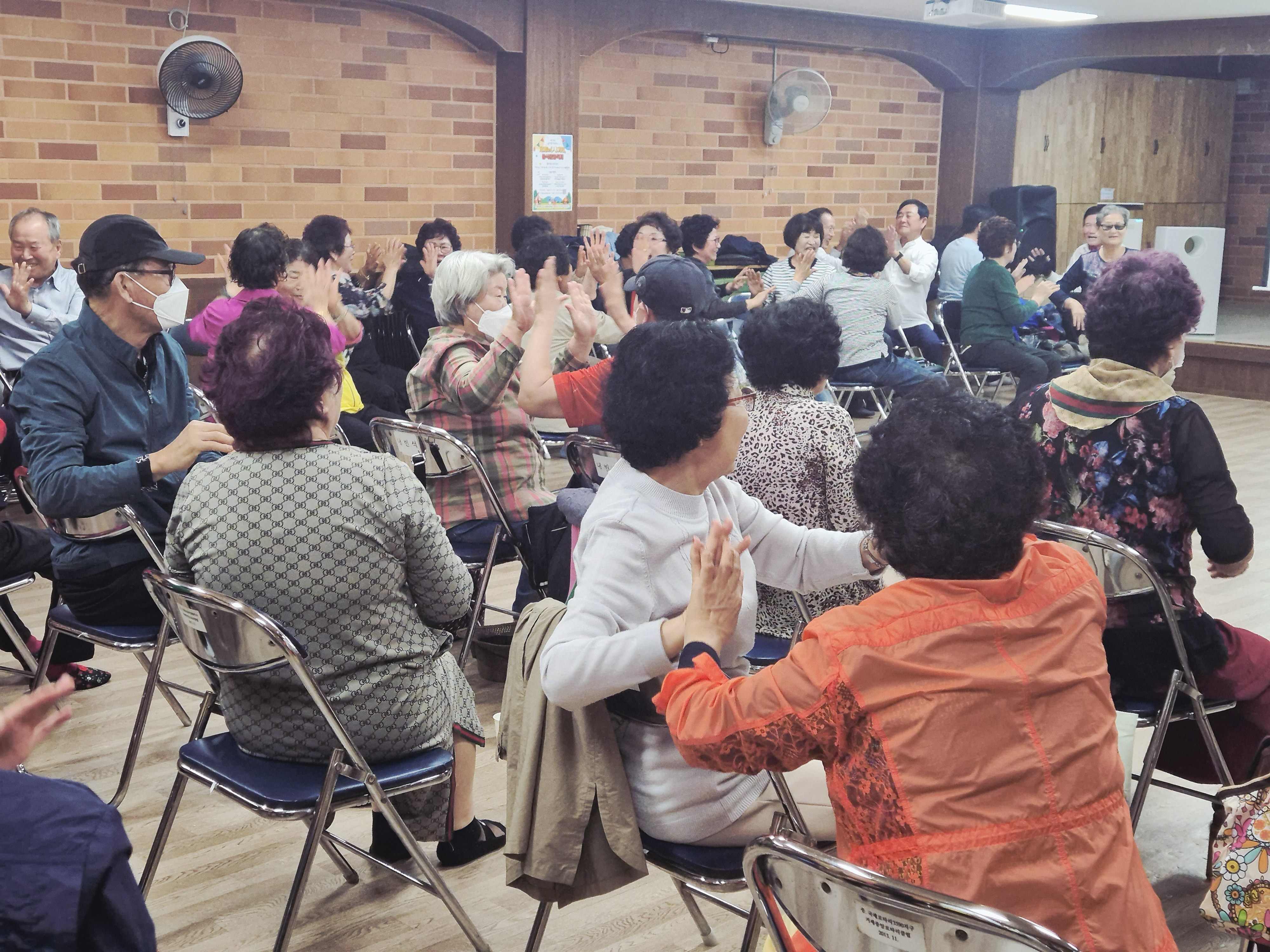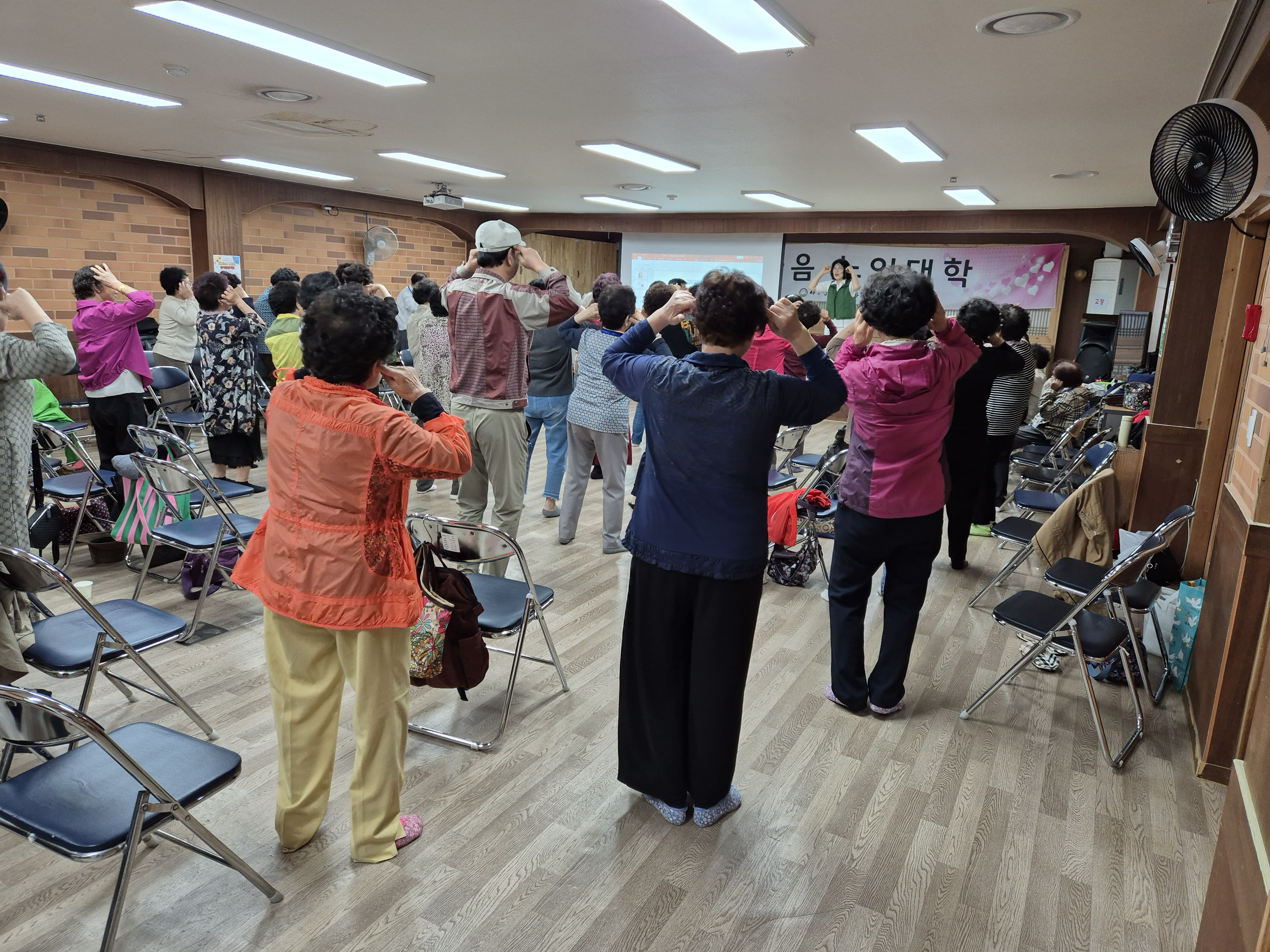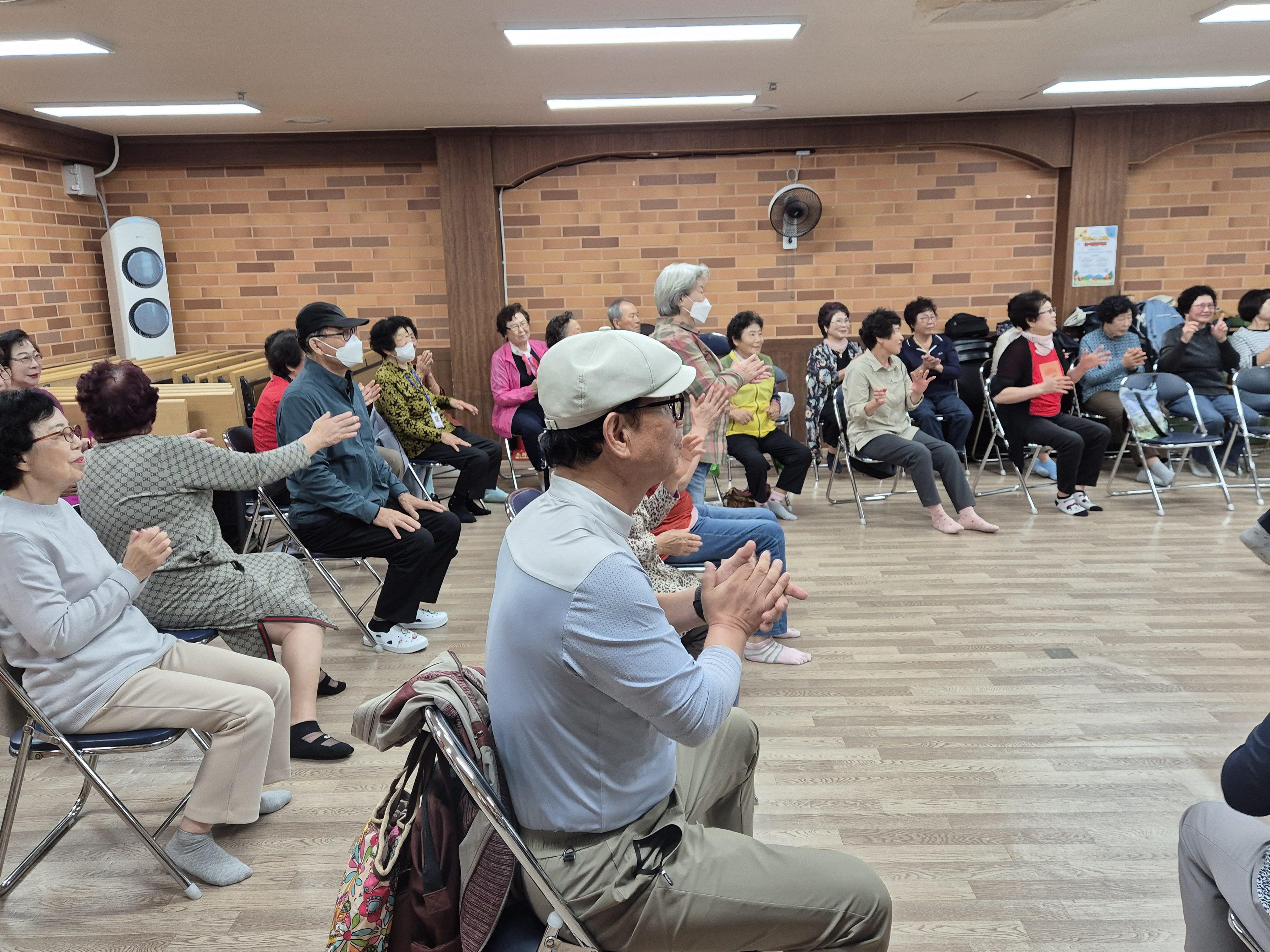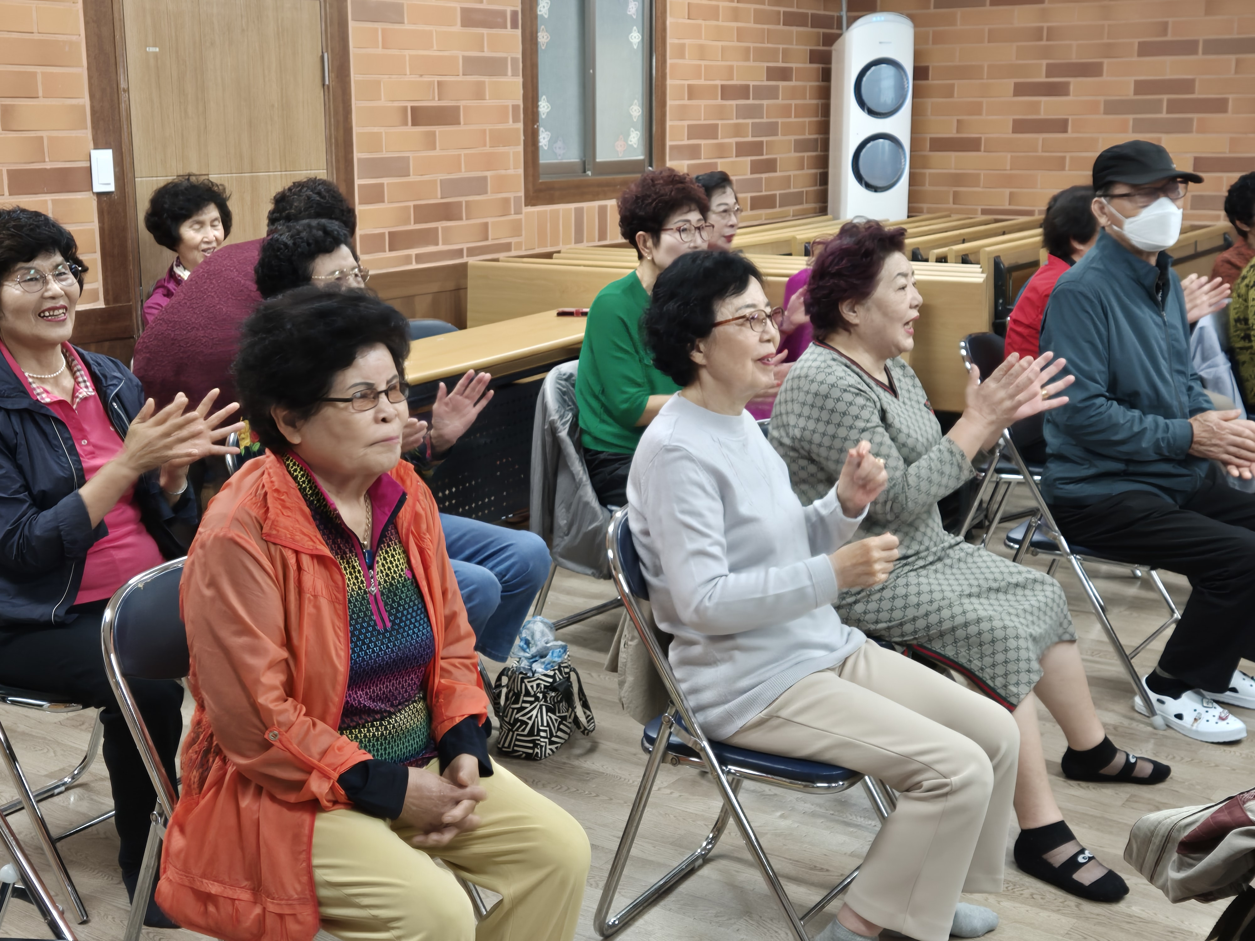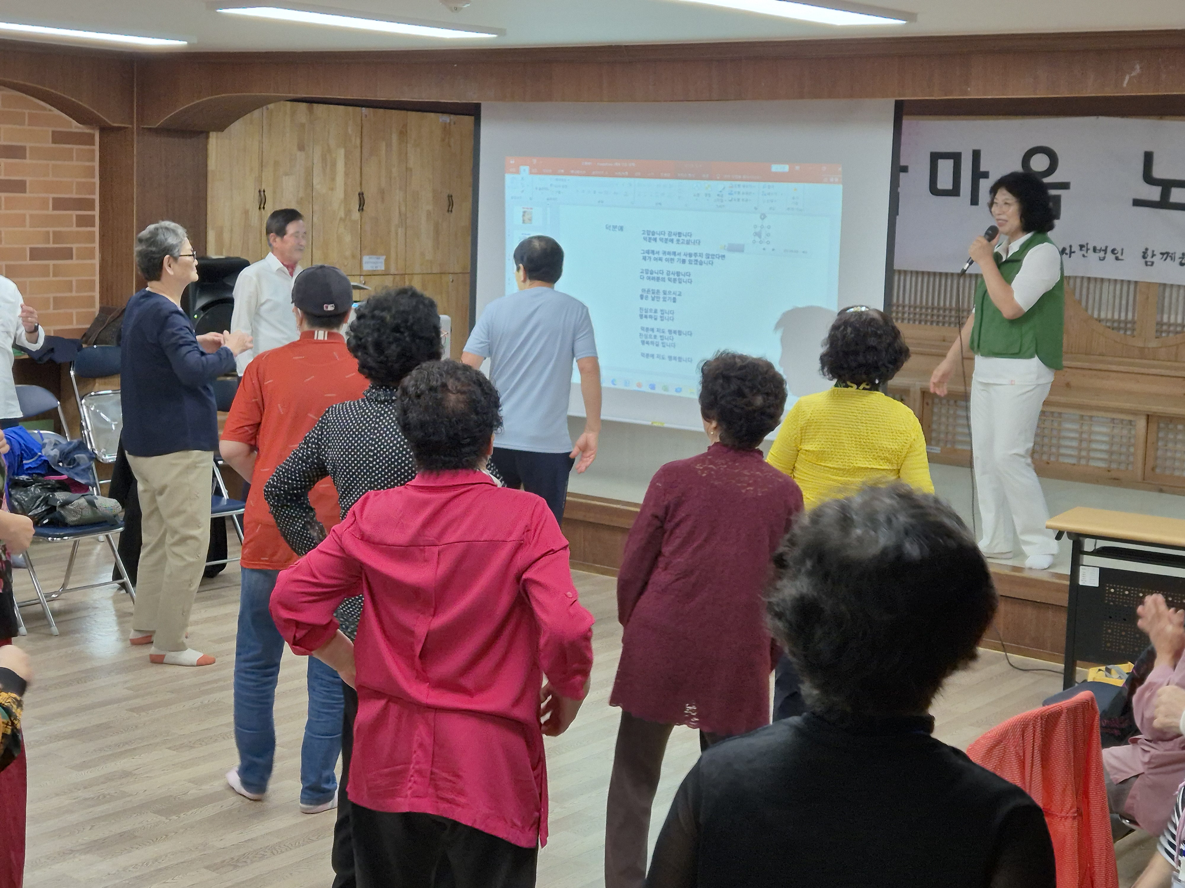 2교시는 노래교실 진행됨. ‘울고 넘는 박달재’라는 노래를 배워보았음. 어르신 대부분 아는 노래라며 좋아하는 모습 보임. 가사를 한 줄 한 줄 따라부르며, 음정과 멜로디를 정확하게 인지하고 박자에 맞춰 잘 따라 부르는 모습 보였음.