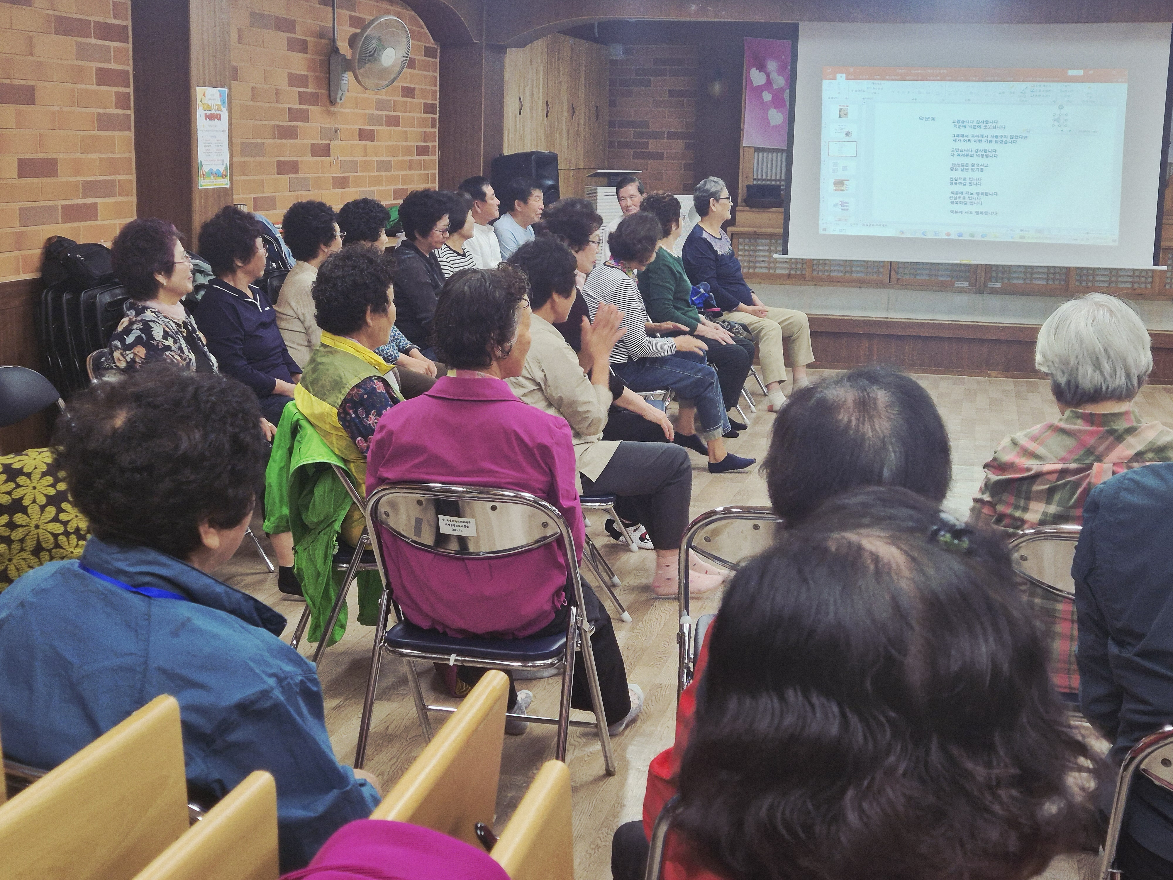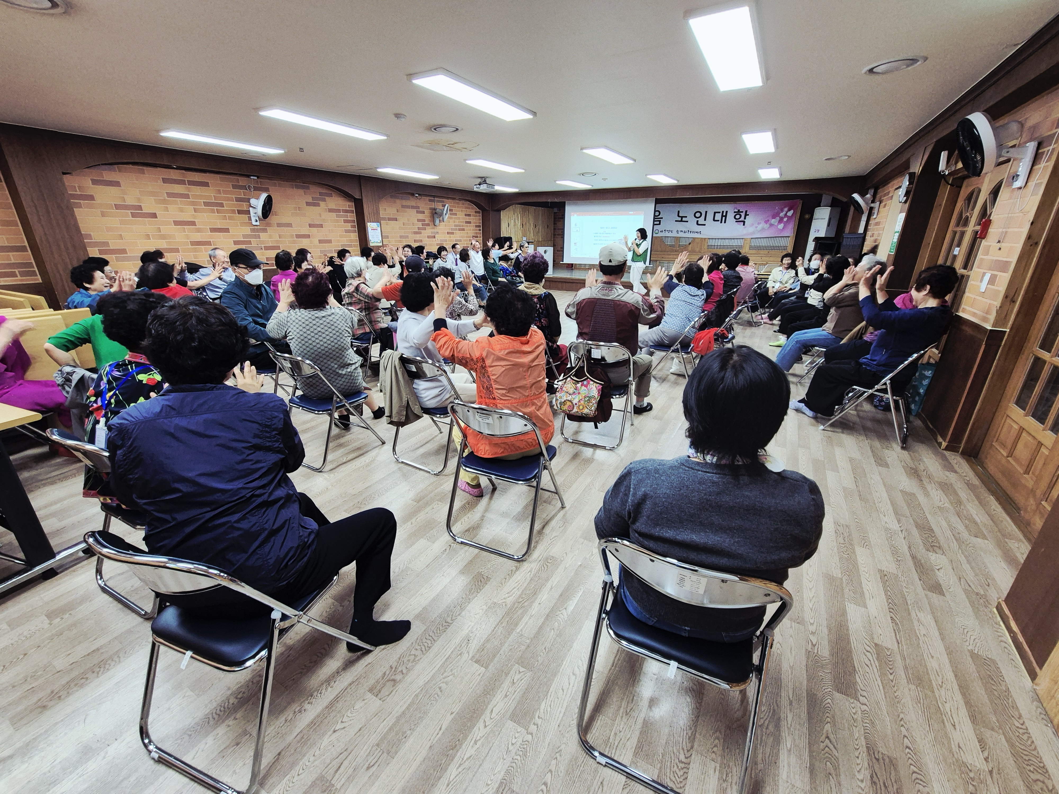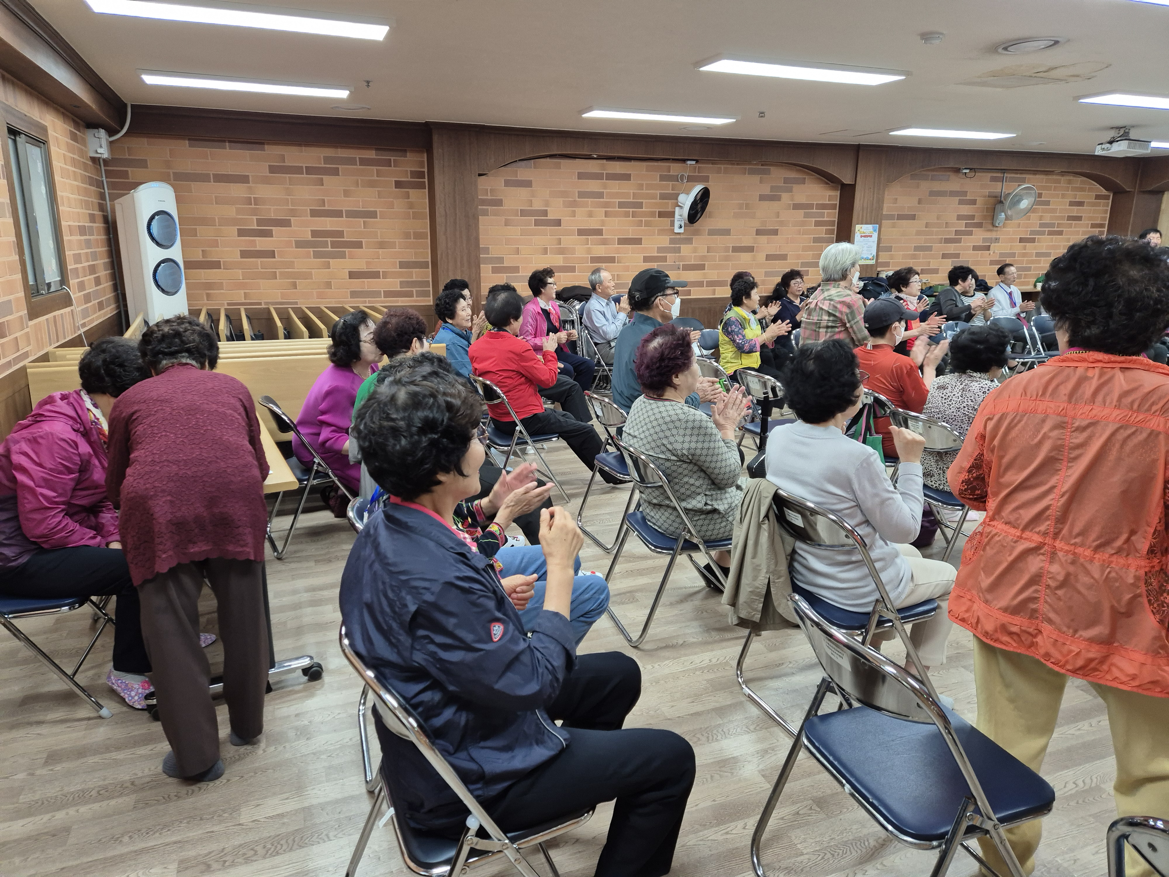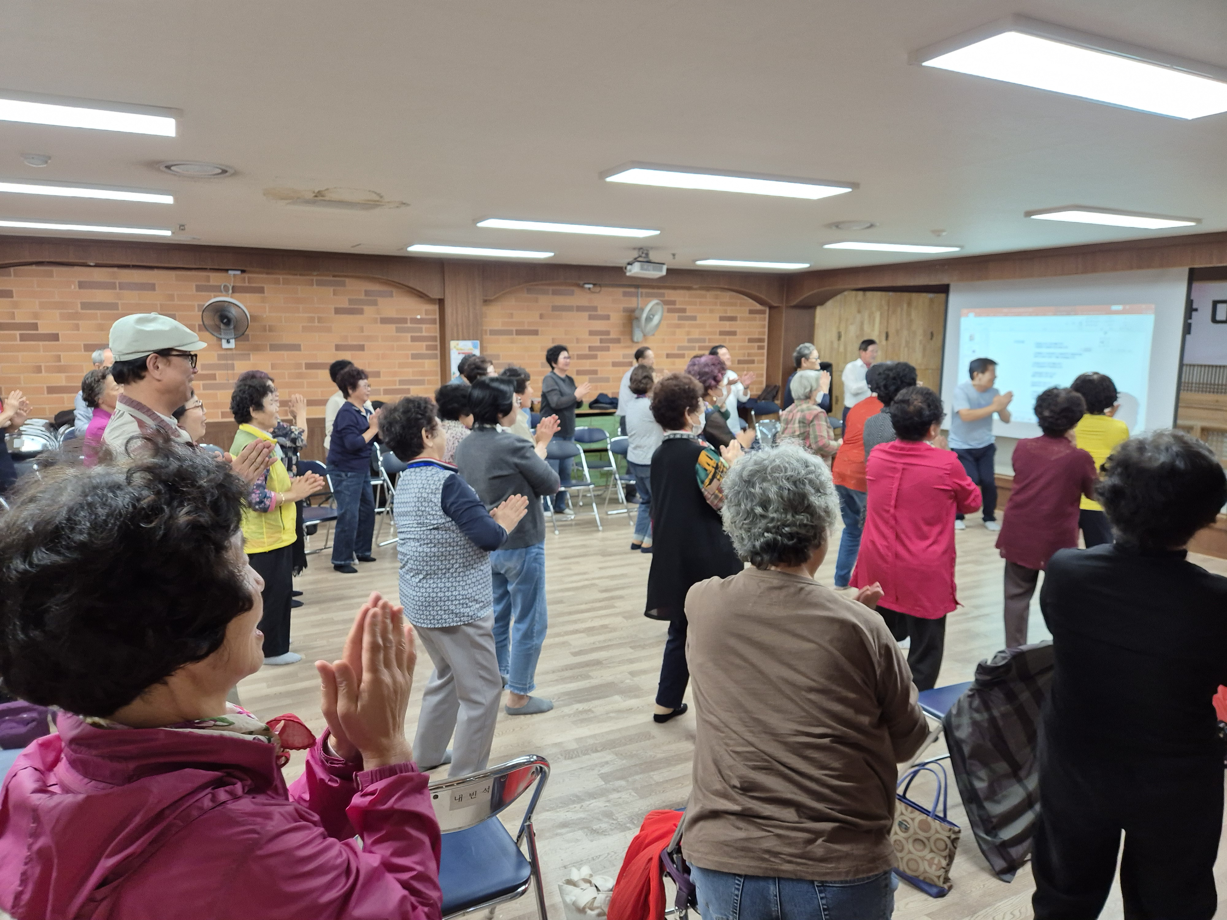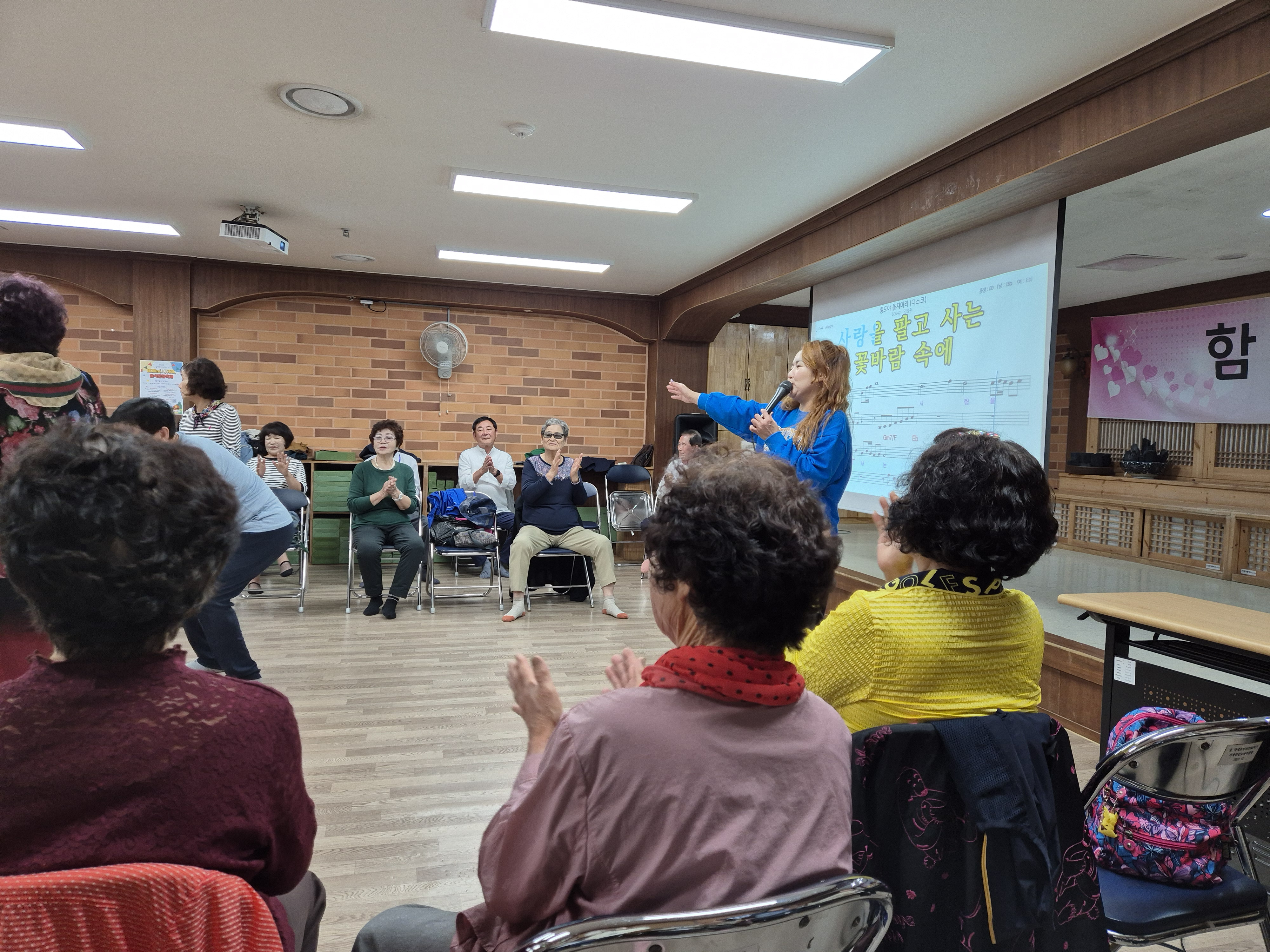 2교시는 노래교실 진행됨. ‘울고 넘는 박달재’라는 노래를 배워보았음. 어르신 대부분 아는 노래라며 좋아하는 모습 보임. 가사를 한 줄 한 줄 따라부르며, 음정과 멜로디를 정확하게 인지하고 박자에 맞춰 잘 따라 부르는 모습 보였음.
