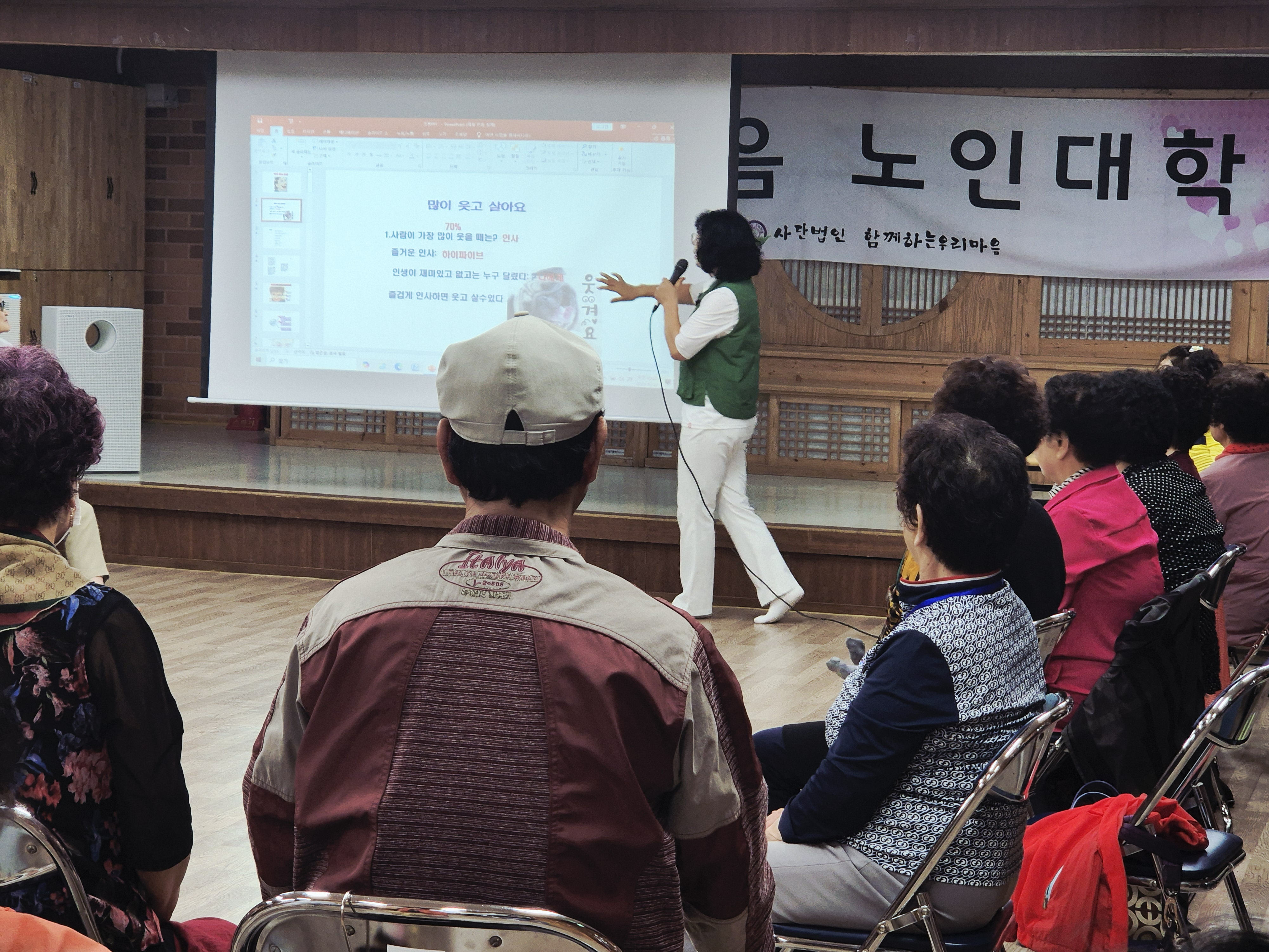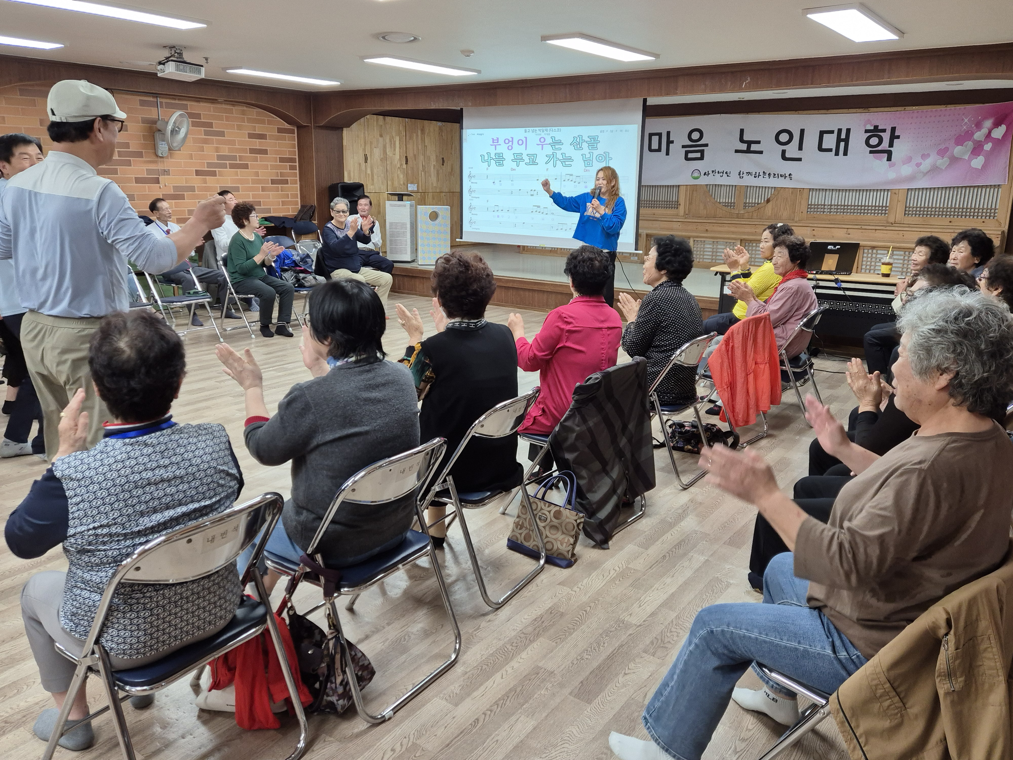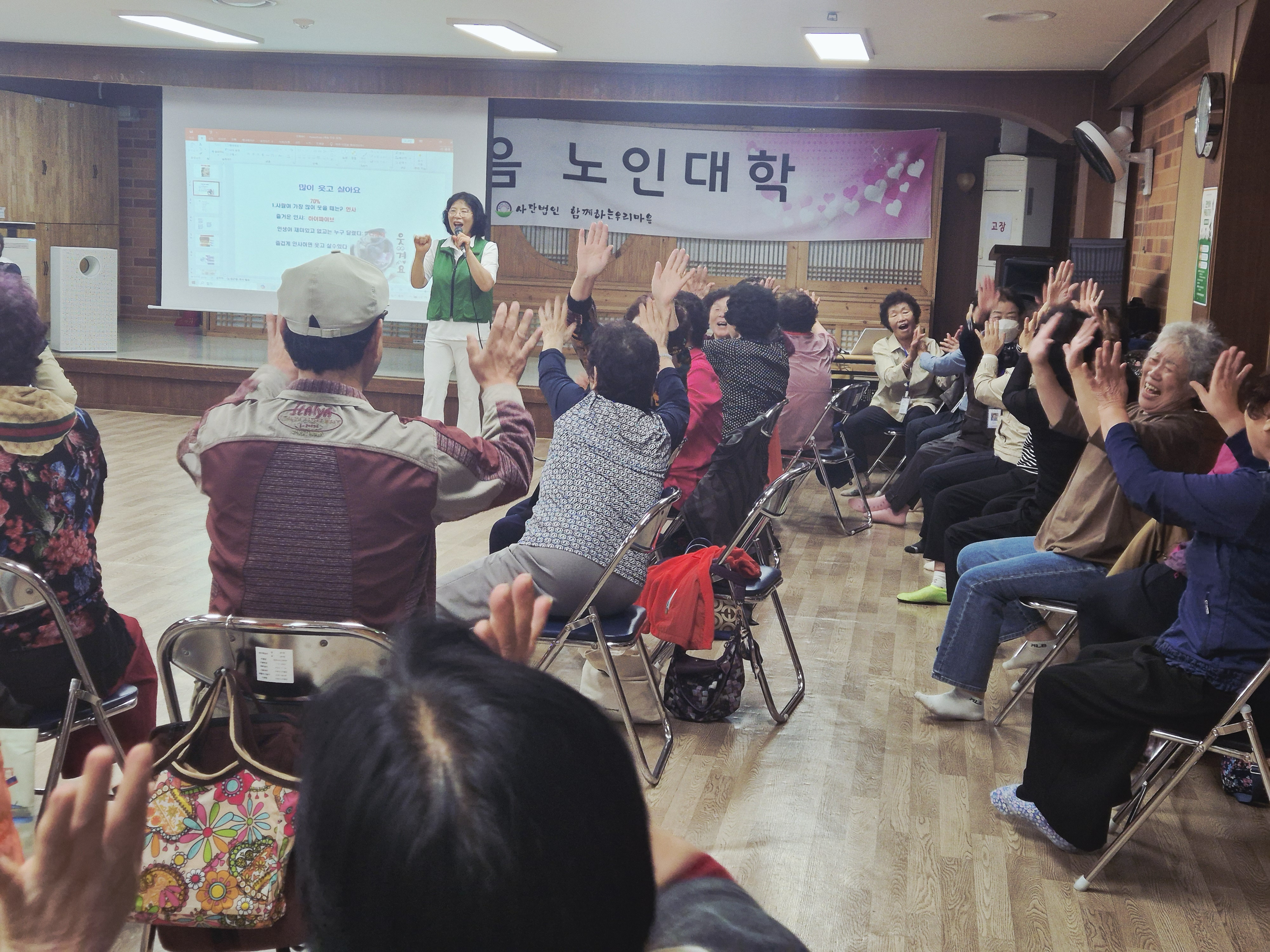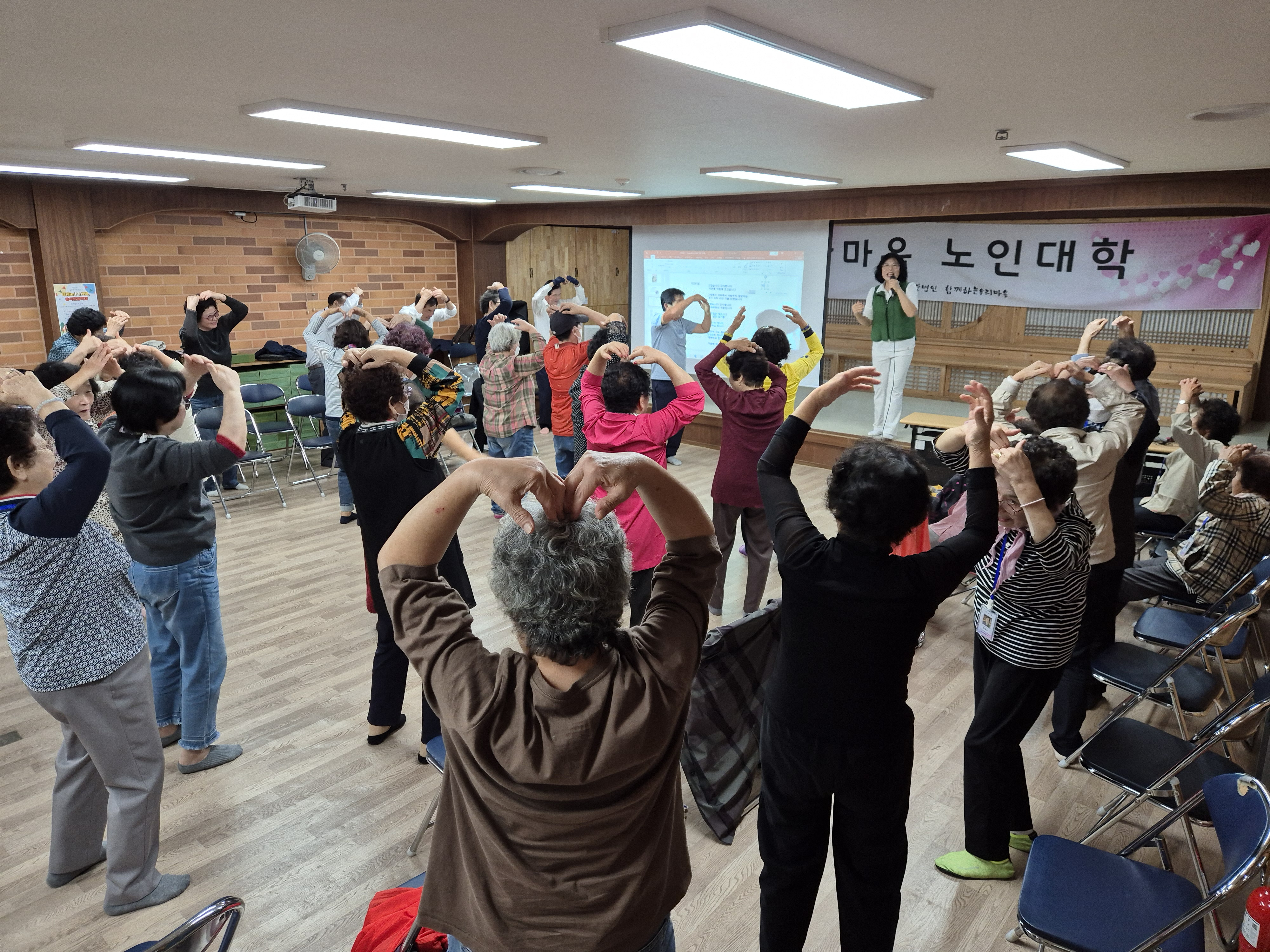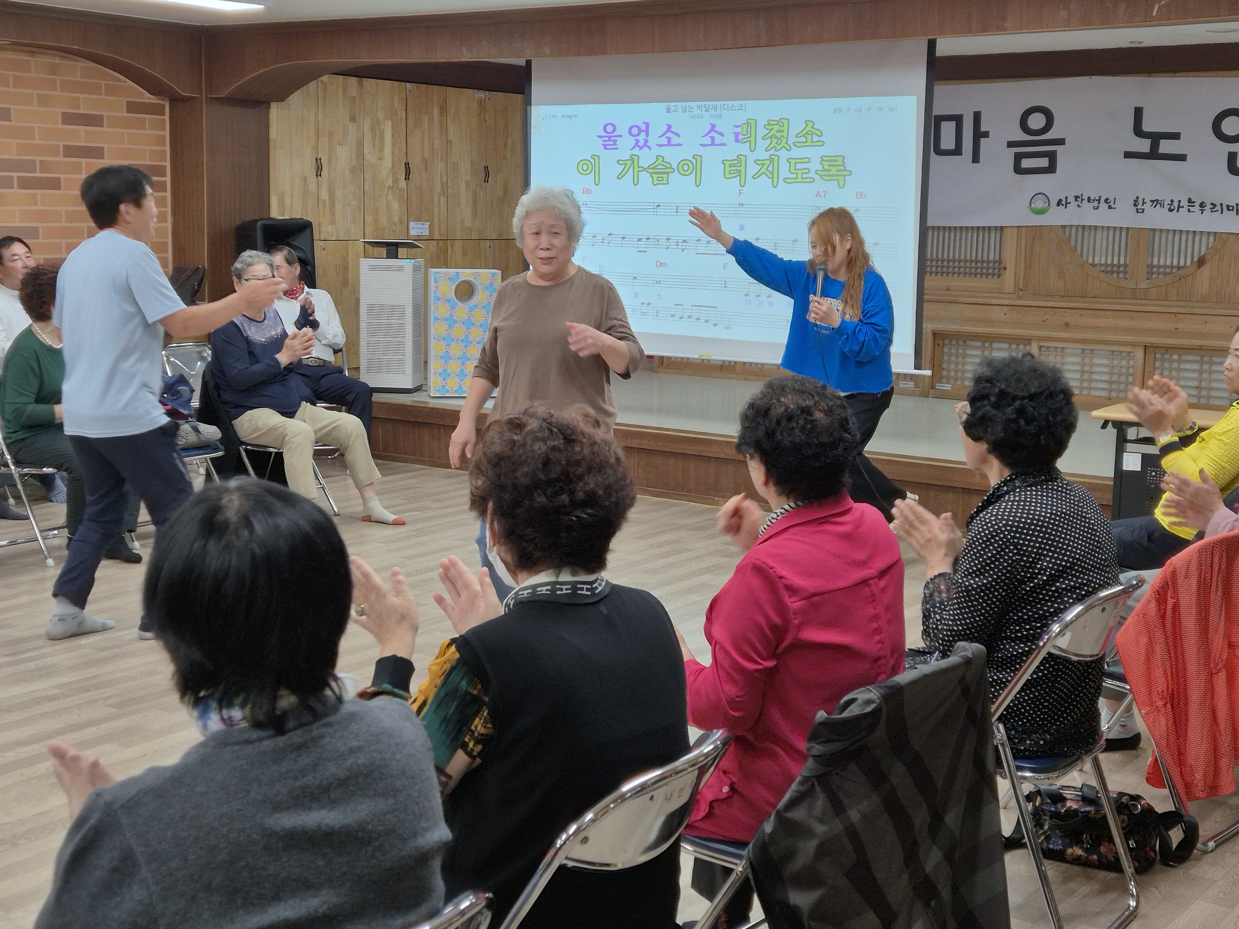 2교시는 노래교실 진행됨. ‘울고 넘는 박달재’라는 노래를 배워보았음. 어르신 대부분 아는 노래라며 좋아하는 모습 보임. 가사를 한 줄 한 줄 따라부르며, 음정과 멜로디를 정확하게 인지하고 박자에 맞춰 잘 따라 부르는 모습 보였음.