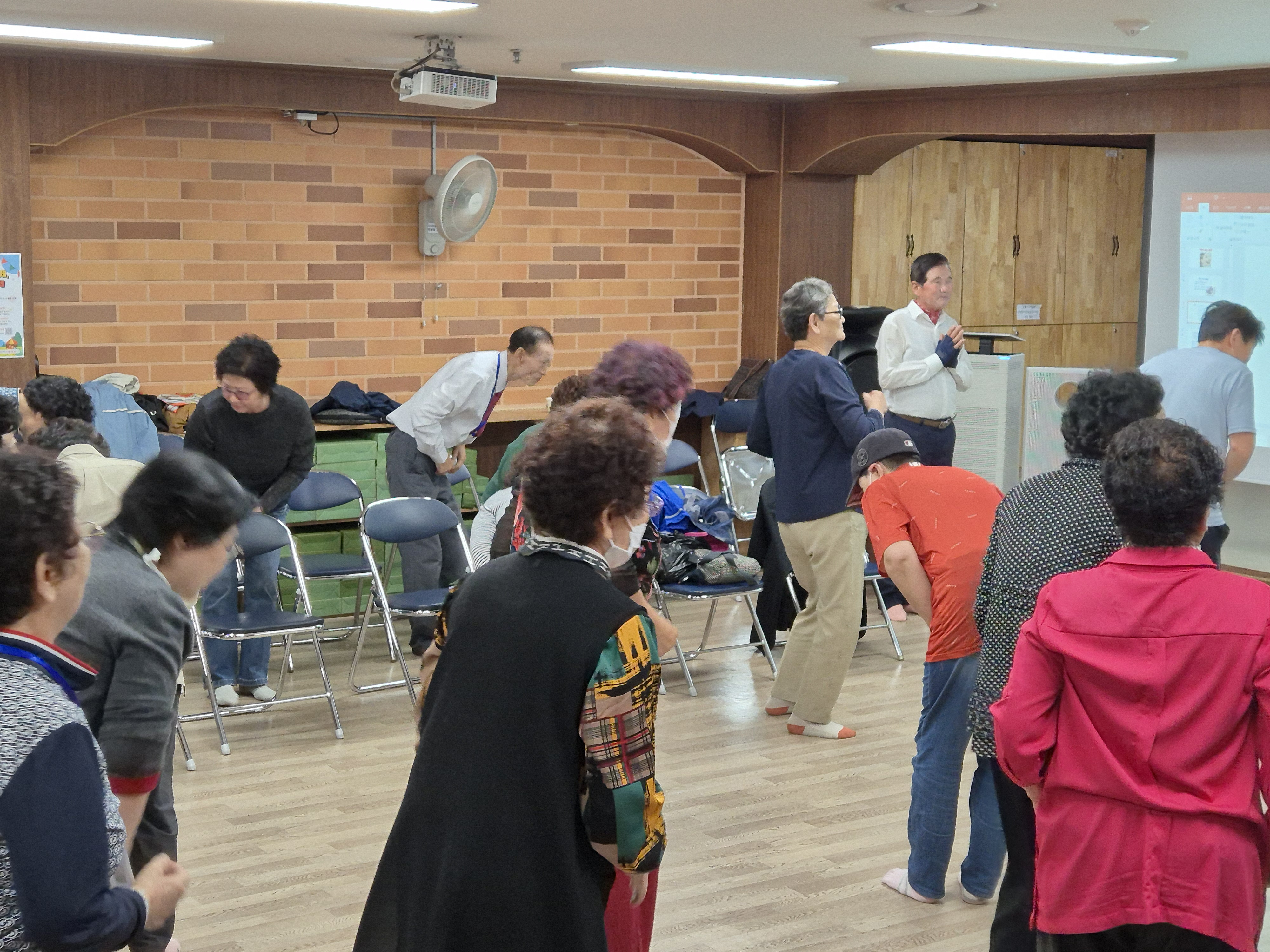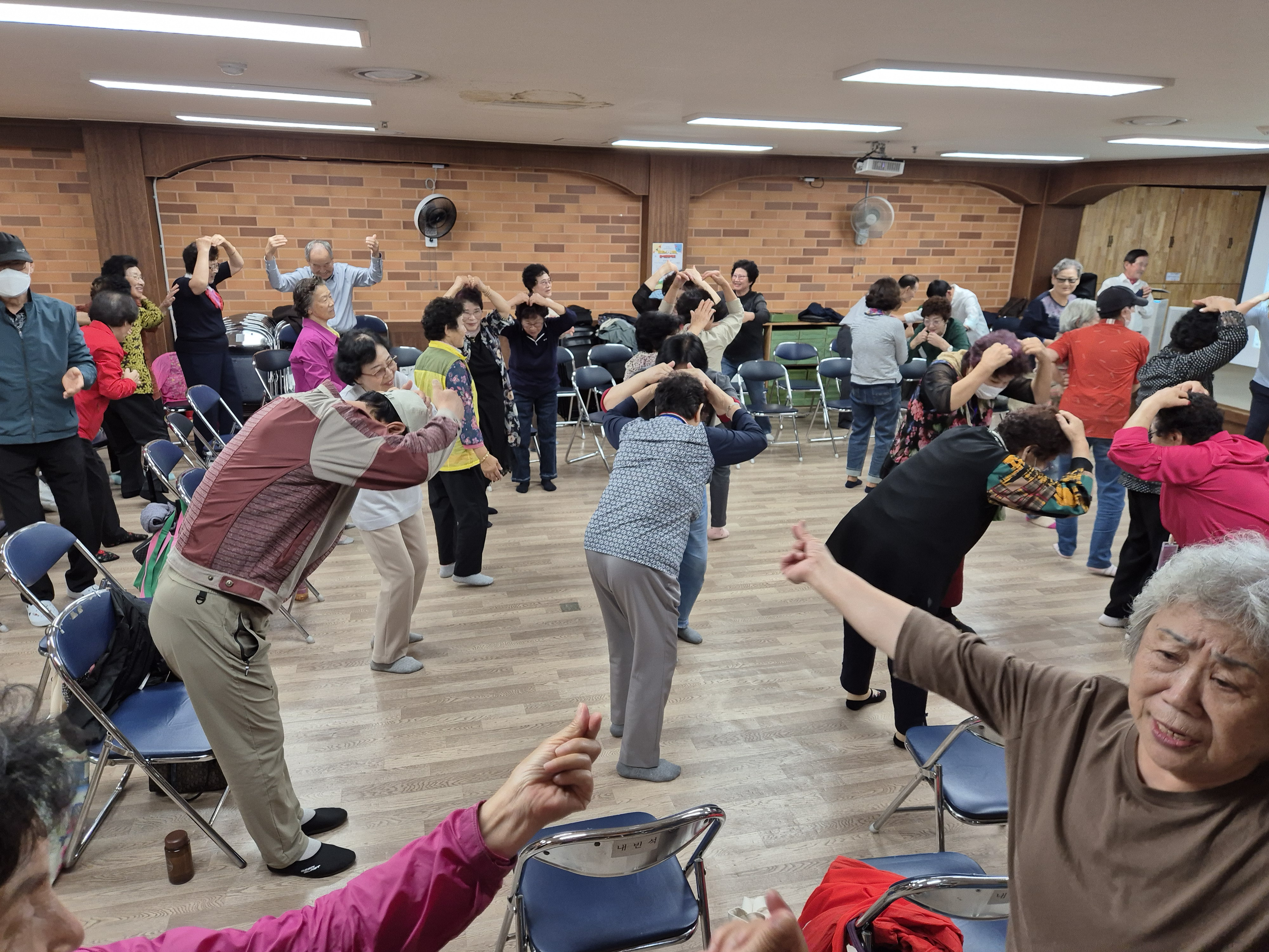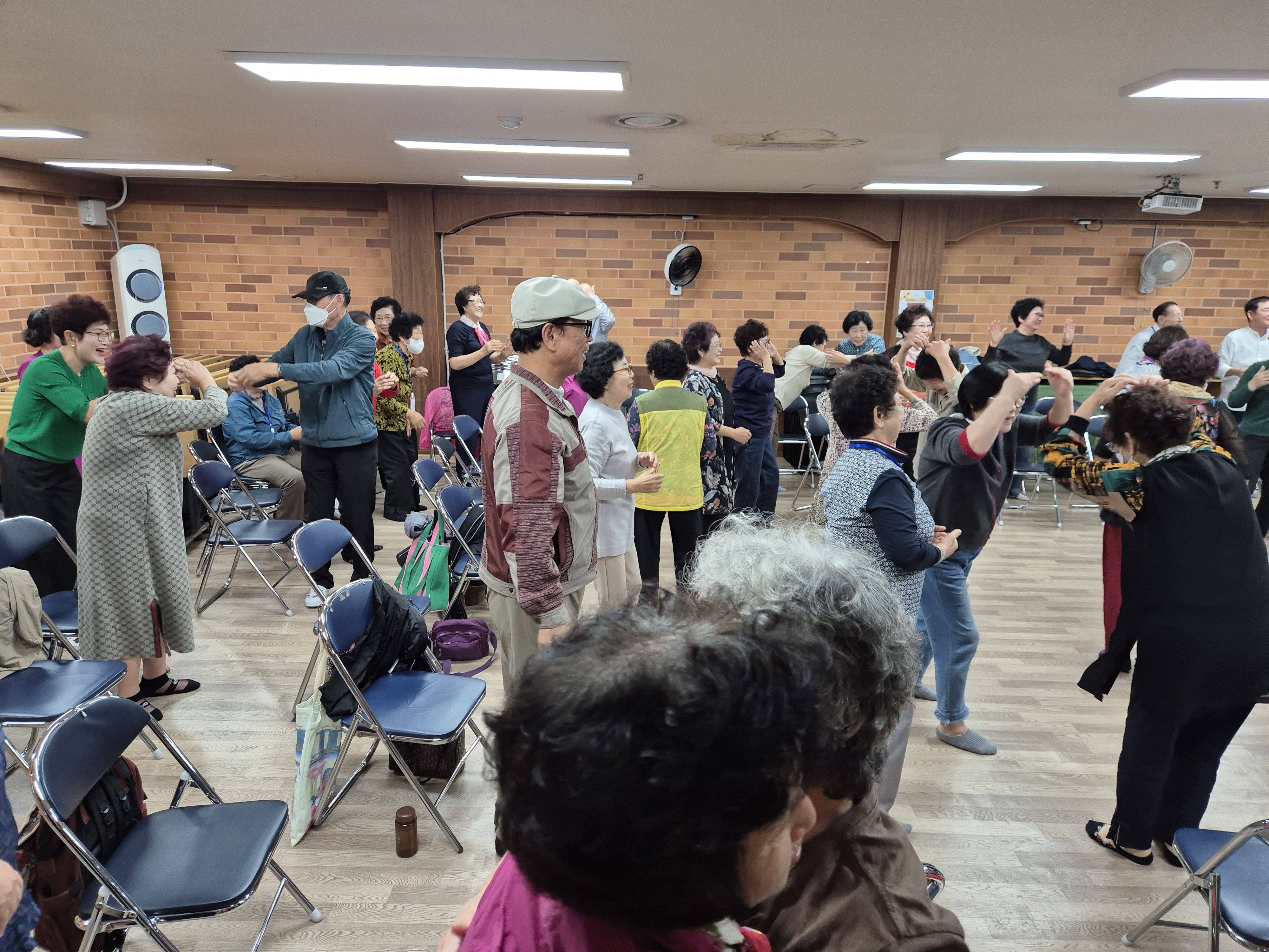 1교시는 라인댄스 진행됨. 어르신들이 오와열을 맞춰 대열을 정리한 후에 강당 앞의 강사를 보고 음악에 맞춰 동작을 따라해 보았음. 어르신들은 서로 마주보며 인사하고 손을 들어 만세하고, 가사에 맞춰 박수를 치는 등 다양한 동작을 반복해서 수행해 보았음. 다들 무리 없이 잘 따라하는 모습 보였고 다리가 불편한 어르신들은 의자에 앉아 팔동작만 따라해 보았음. 새로 오신 남자 어르신은 적극적으로 수업에 임하며, 앞에 나와 손수 시범을 보이는 등 높은 참여 의지를 보임.
