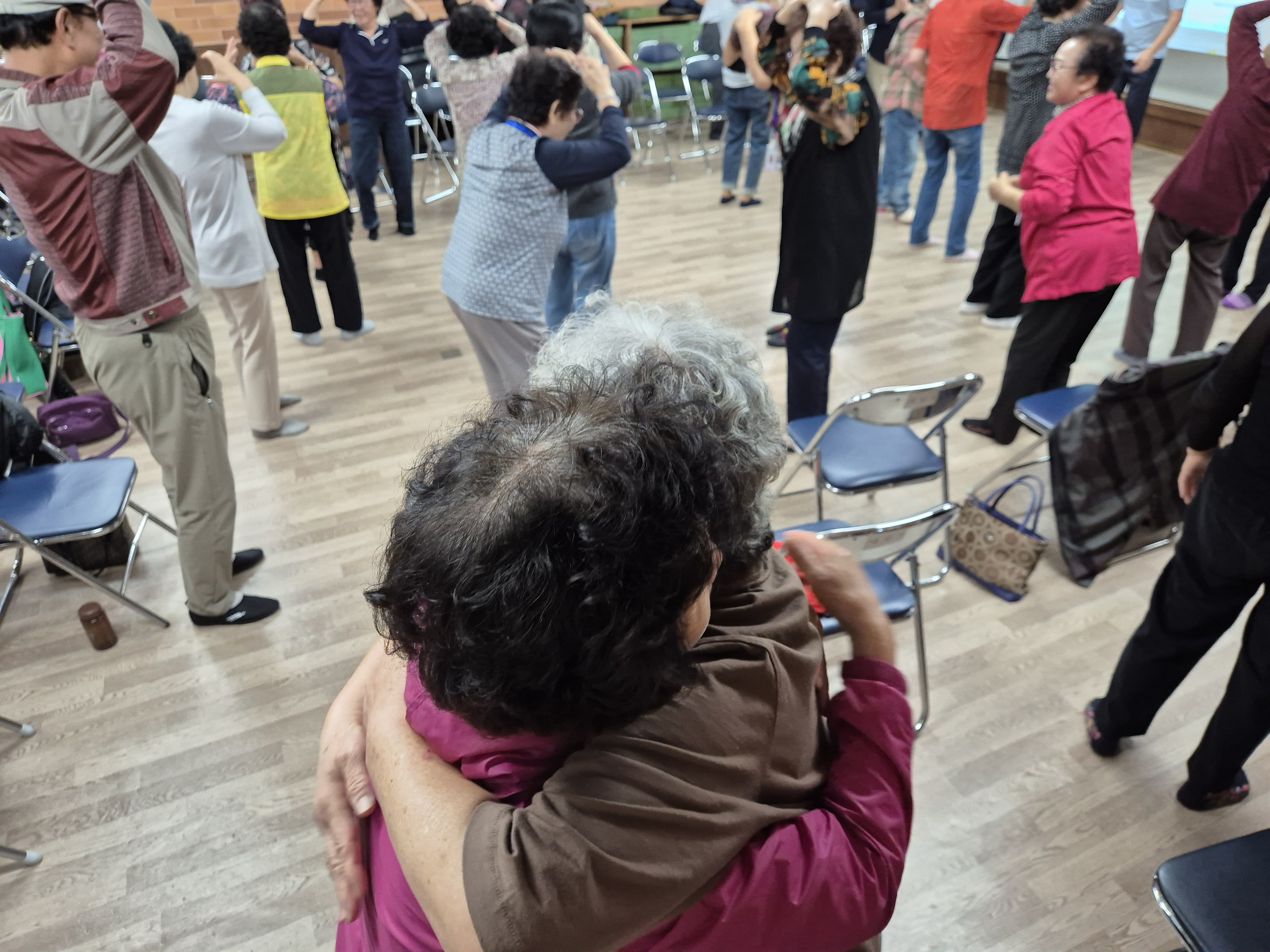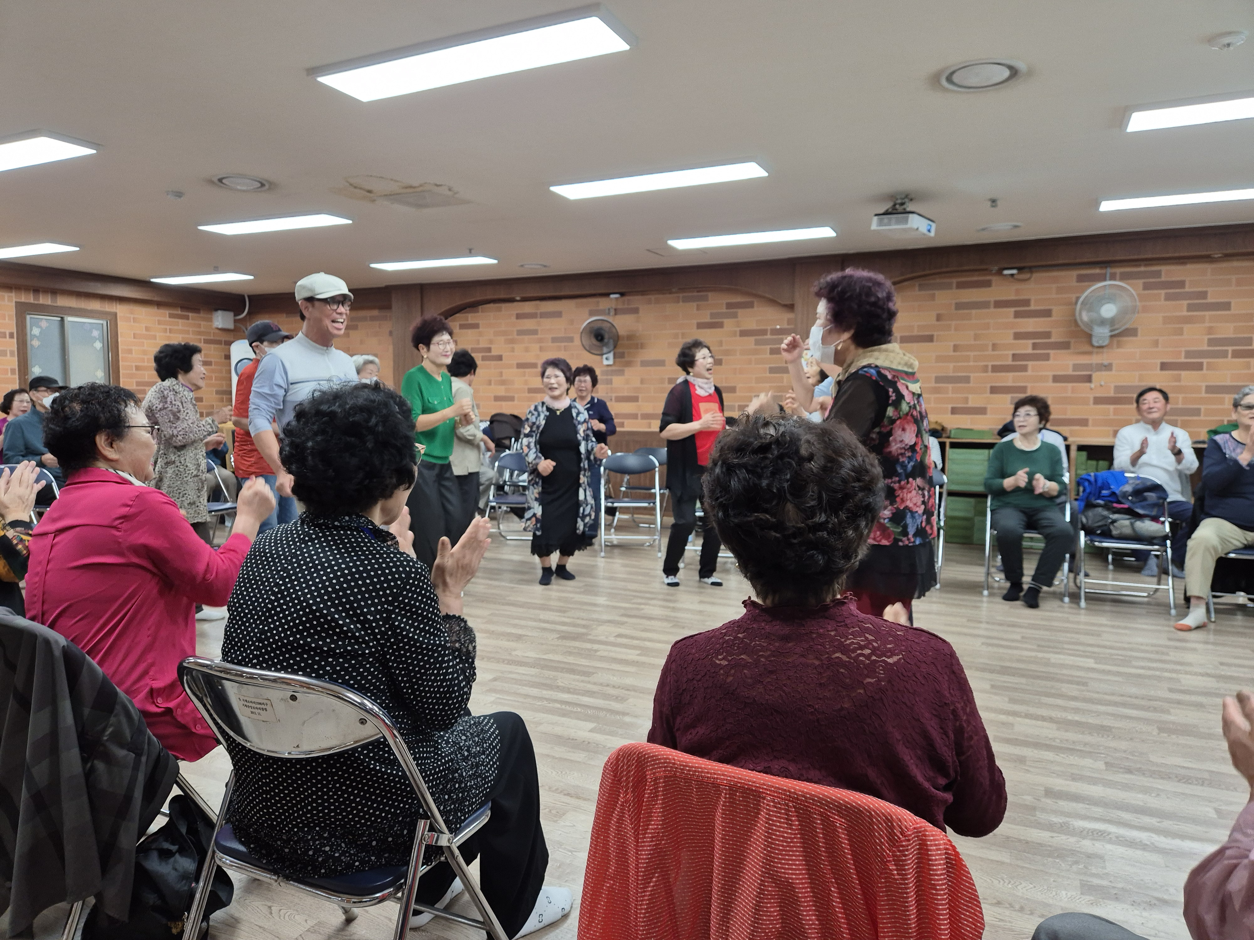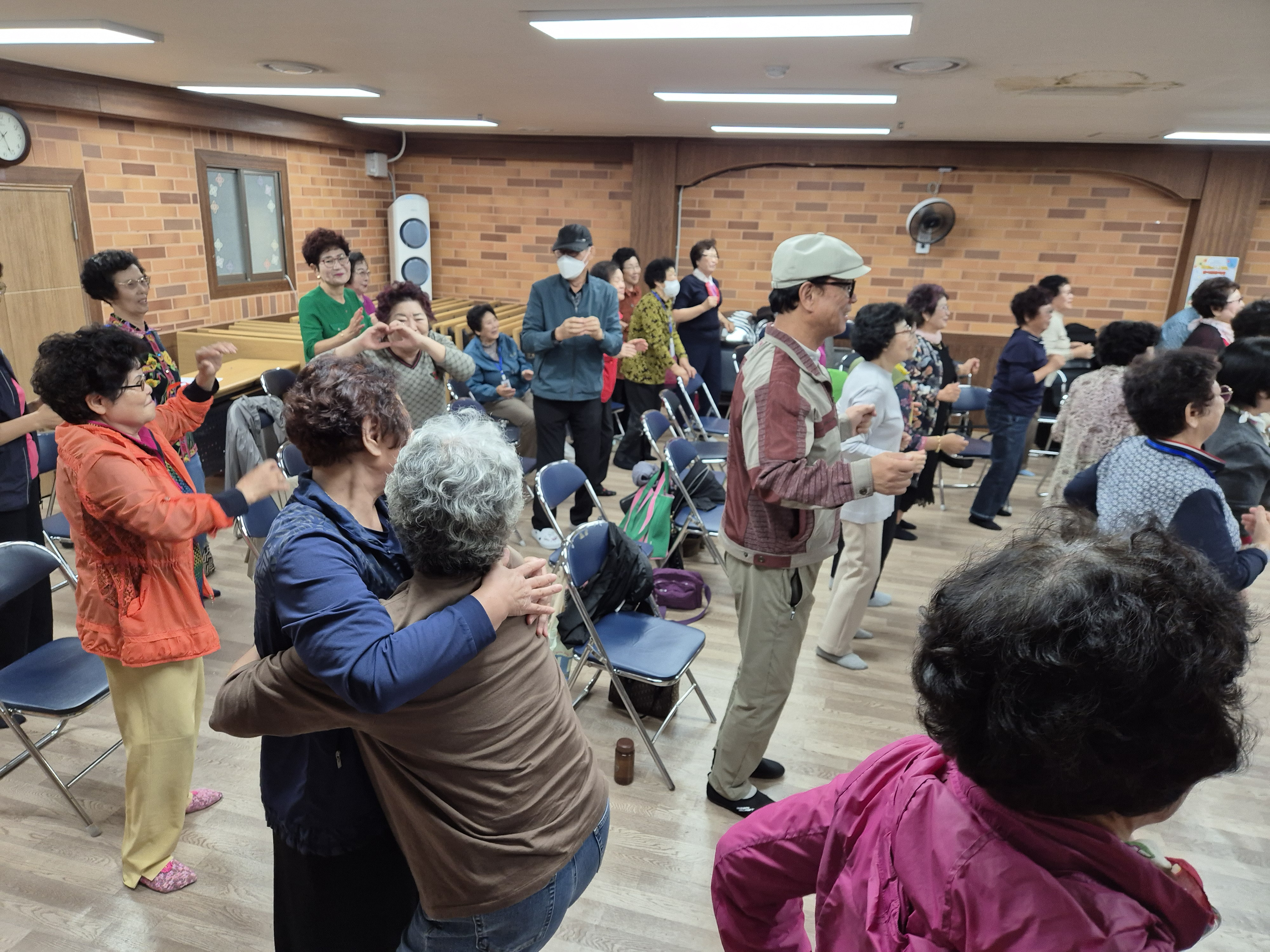 1교시는 라인댄스 진행됨. 어르신들이 오와열을 맞춰 대열을 정리한 후에 강당 앞의 강사를 보고 음악에 맞춰 동작을 따라해 보았음. 어르신들은 서로 마주보며 인사하고 손을 들어 만세하고, 가사에 맞춰 박수를 치는 등 다양한 동작을 반복해서 수행해 보았음. 다들 무리 없이 잘 따라하는 모습 보였고 다리가 불편한 어르신들은 의자에 앉아 팔동작만 따라해 보았음. 새로 오신 남자 어르신은 적극적으로 수업에 임하며, 앞에 나와 손수 시범을 보이는 등 높은 참여 의지를 보임.