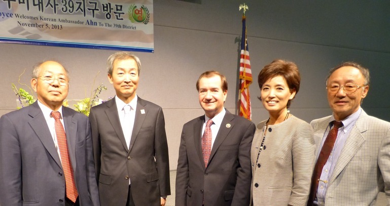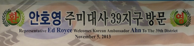 2013년 11월 5일.(화요일) 로이스 의원(Edward R. Royce Member of Congress 39th District . California)은 풀러튼의 은혜한인교회(1645 W. Valencia Dr.)에서 안호영 주미대사 초청 한인사회 좌담회를 개최한후 기념촬영을 했다.