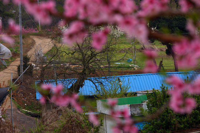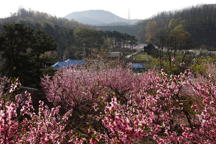 ▲ 2009년 둔터골 뒷산에서 바라본 마을과 복사꽃에 묻힌 회화나무 © 최영숙 |