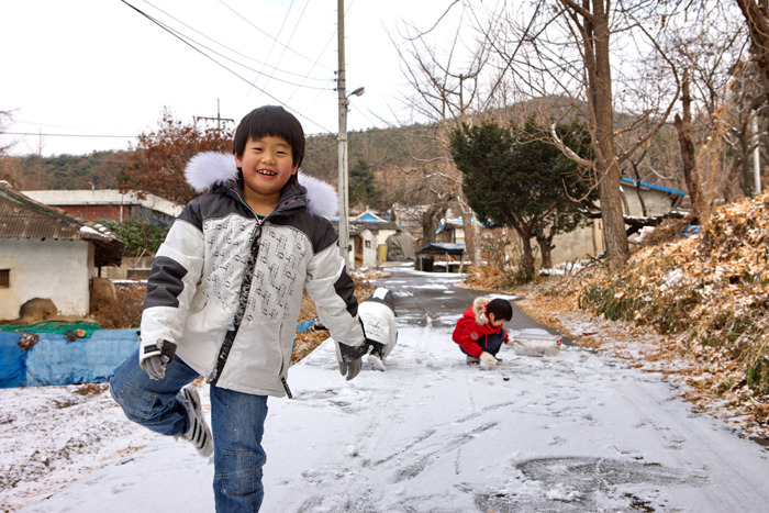 겨울이 되었다. 어린이들은 마을 길에서 즐겁게 놀았다. 멀리 회화나무가 보였다.