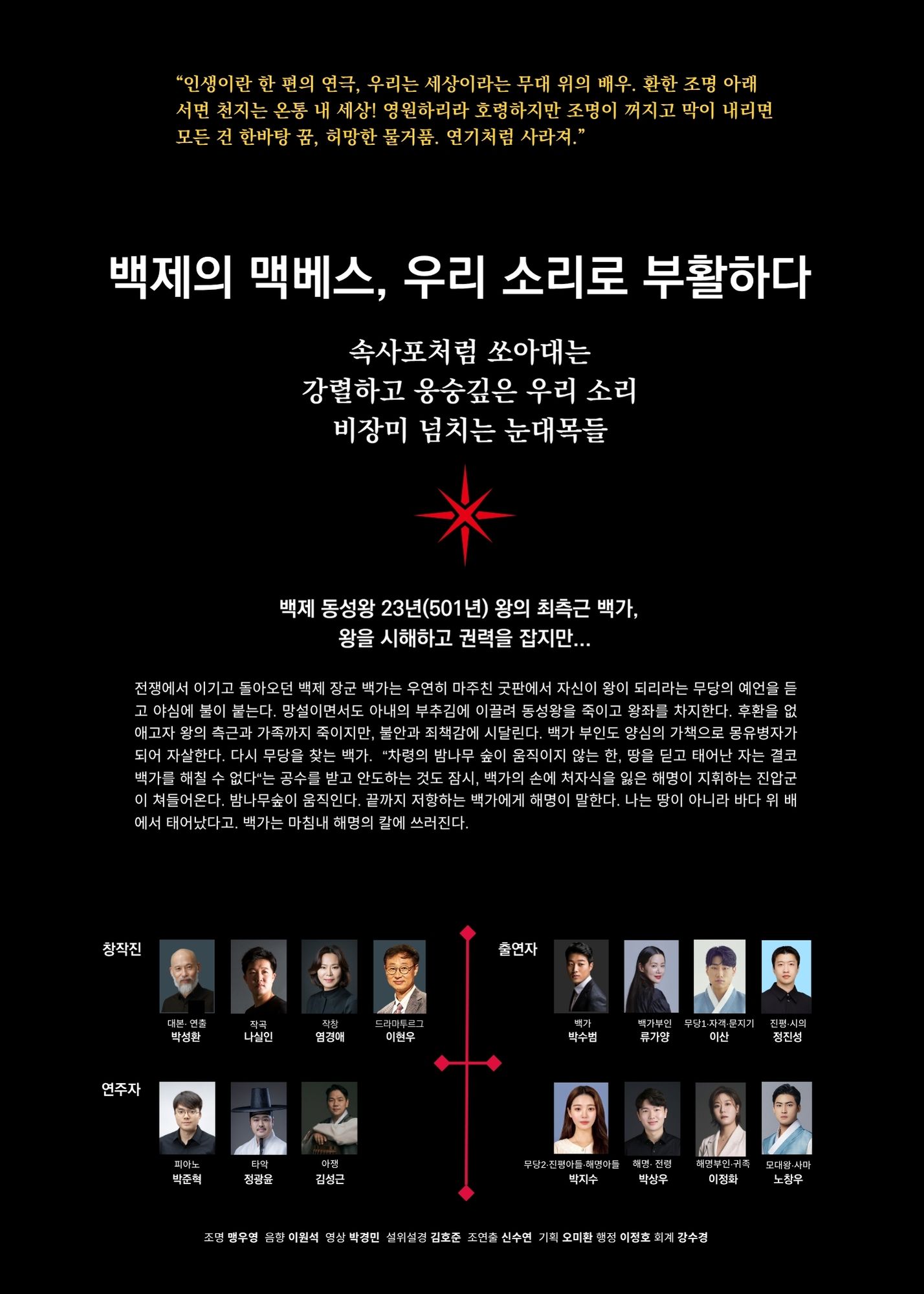 1500년 전 웅진백제의 왕도 공주에서 동성왕 시해사건을 일으킨 벡제 장군 백가. 야망과 죄책감, 걷잡읗 수 없이 파멸로 치닫는 한 남자의 이야기, 셰익스피어 원작 '맥베스'가 백제의 맥제스가 되어 서울에 찾아옵니다. 최고의 창작진(대본/연출 박성환, 작곡 나실인, 작참 염경애)이 뭉쳐서 자신있게 내놓는 작품입니다. 초연 2025년 11월 2일 공주문예회관. 기대하셔도 좋습니다. 놓치지마세요.